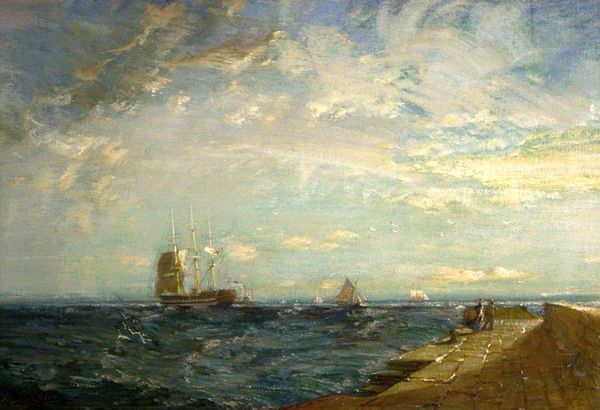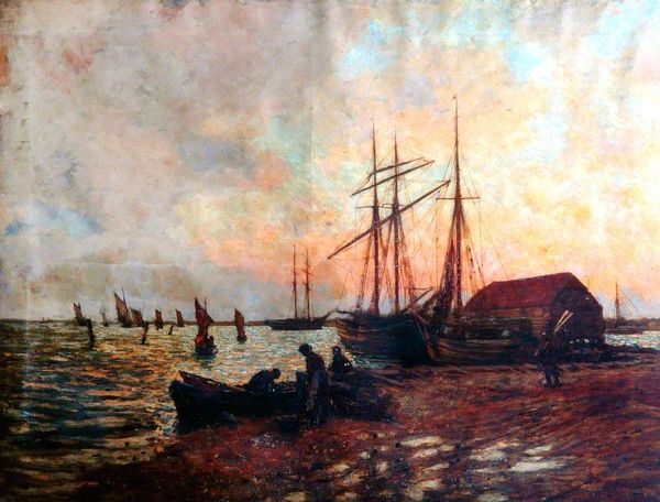 Albert Bierstadt likely painted this scene of Nassau Harbor with oil on canvas, using brushes to apply layers of color, blending and feathering to create atmospheric effects. The shimmering water and sky are rendered with smooth gradients, while the boats and figures are more thickly painted, creating texture. Bierstadt’s technique reflects a desire to capture the visual experience of light and atmosphere. There is no evidence of labor visible in the artwork itself, but the image speaks to the industrialization of leisure, and the rise of tourism as a form of mass consumption. The steamship in the background is emblematic of this shift, facilitating travel and trade in the region. Consider how the artist's technical skill serves to present a vision of nature shaped by industry and commerce. These elements are inextricable from the landscape he depicts. In the end, it's the intersection of materials, making, and context that truly illuminates this piece, and challenges us to see beyond conventional art boundaries.