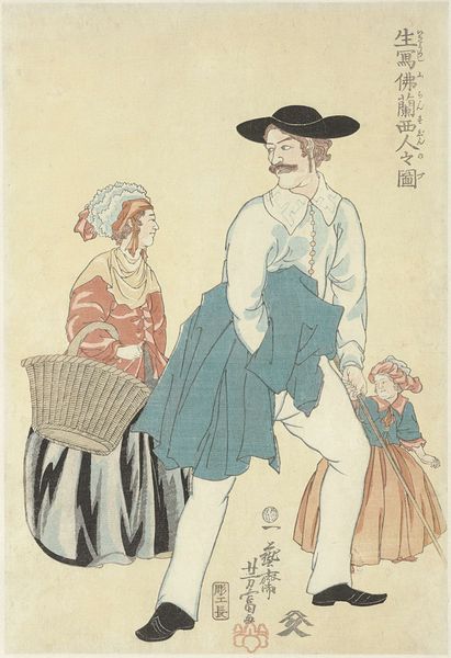 Editor: This woodblock print, "An American Family," by Utagawa Yoshifuji, is a fascinating depiction. I’m struck by the caricatured features and the almost cartoonish rendering of Western clothing. What do you see in this piece, particularly in terms of cultural representation? Curator: It's about the symbolic weight of images. Notice how the artist exaggerates and simplifies Western fashion. These details aren't just inaccurate; they act as cultural markers, highlighting perceived differences between the Japanese and the "Amerikajin." How do these choices shape the viewer’s understanding? Editor: So, it's less about literal representation and more about communicating a specific idea about American identity. Fascinating! Curator: Precisely! The symbols used provide continuity over time. We can observe here how the image conveys cultural memory. Editor: This really changes my perspective. I’ll definitely think more about the underlying cultural messages in similar artworks now.