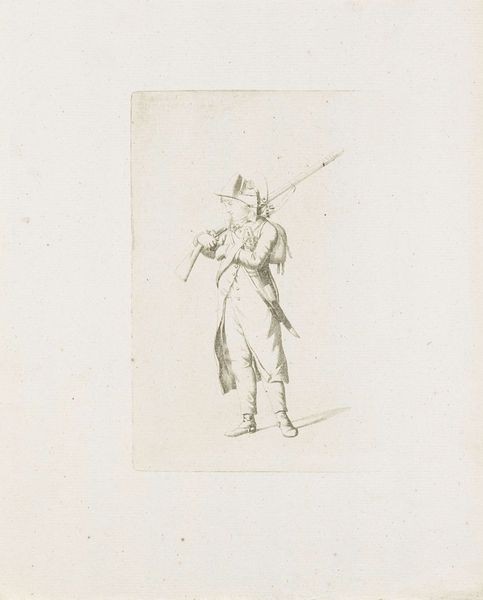 Curator: This delicate pencil drawing is titled "Standing French Soldier," created around 1795 by August Christian Hauck. It is currently held in the Rijksmuseum collection. Editor: It feels fragile. There's something almost vulnerable about this solitary figure viewed from behind. The lightness of the pencil work makes him seem transient, like a ghost of the past. Curator: Indeed. Hauck’s artistic output was largely influenced by the socio-political climate of the late 18th century. Remember, this was the period of the French Revolution, and military figures became symbolic within both public and artistic spheres. Editor: I think there is an interesting power dynamic implied in this rendering, one that touches on gender, race and identity. Considering the history of marginalized figures in the army who were often relegated to service and unseen, the piece may function as a testament of perseverance. Curator: That's a valid point to explore, especially considering the shift from aristocratic military structures towards more national armies. This artwork can also be contextualized by Hauck’s practice: his drawings usually appear like initial studies for paintings or prints. It offers a glimpse into his process. Editor: It strikes me, too, as deeply humanizing. Away from the battlefield and heroic portrayals, it seems to subtly critique the glorification of war by simply depicting a soldier as just a person bearing the weight of duty. Curator: I agree. There is definitely an anti-heroic quality, typical of much Romantic-era art. It invites us to consider the individuals behind the uniforms, especially within times of great sociopolitical turbulence, not just in the context of then, but within our contemporary societies, too. Editor: Absolutely. Seeing art through these intersectional lenses really compels us to think about not just what we are seeing, but also who gets seen, and whose stories are told. Curator: Examining Hauck's study today offers a lens through which to interpret both past representations of soldiery and present day military conflicts and imagery, as well. Editor: Yes. By emphasizing the emotional resonance and complex humanity within the figure depicted in Hauck's drawing, we challenge viewers to actively question their assumptions.