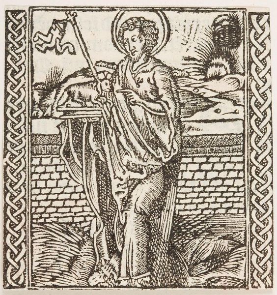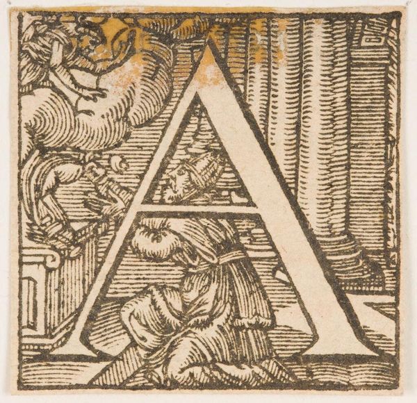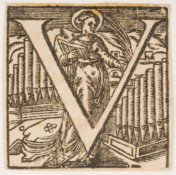 Editor: This woodcut, "Letter V," by an anonymous artist, seems to depict a saint playing a harp within the letterform. The composition feels very symbolic. What social narratives do you see at play here? Curator: Considering it's a letter, we need to think about literacy and access to knowledge. The saint, likely representing virtue, is framed by the letter, but also by instruments of power: the organ and her harp. What does it mean when knowledge and virtue are gatekept? Editor: That's a compelling point about gatekeeping. So, the letter itself becomes a symbol of restricted access. Curator: Precisely. And we have to question, who is being excluded from this visual and intellectual space? What ideologies are being reinforced? Editor: I never would have considered that perspective! Thanks, this has given me so much to think about. Curator: It’s crucial to remember that even something as seemingly simple as a letter can embody complex power dynamics.