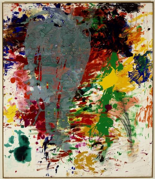 Curator: Here we have Sam Francis's "White Line," an acrylic on canvas creation from 1958-1959. It’s a significant example of Abstract Expressionism, particularly his signature style of allover painting. What's your immediate take? Editor: Spacious, yet intense! I get this feeling like I’m staring at two separate storms, both vying for attention across this vast, bright emptiness. There’s a lot of emotional weather happening. Curator: Interesting. Yes, Francis deliberately uses the white of the canvas, not as a background, but as an active, breathing space, a void as important as the painted forms themselves. Look at how those color clusters almost levitate, defined as much by what's there as by what isn't. Editor: Exactly! It's this negative space that really sings. The brushwork is pretty frenetic, which really gives energy to the edges, where the colors almost seem to want to burst outward. Curator: His color choices are masterful. Notice how he positions the reds, blues, yellows and purples, letting them collide and merge, always maintaining luminosity, and yet contained. He invites chaos and manages to impose order. Editor: Definitely contained. Like there's a tension holding it all back from exploding outwards. Almost as though those blocks of color have been pushed aside to reveal all this emptiness between them. Curator: Some say his work is heavily influenced by his personal struggles with health and existential questions. His approach involves improvisation. Francis seemed to allow paint to move and drip organically across the canvas, creating these spontaneous explosions of color. Editor: That definitely tracks with the visual tension. For me, personally, it feels a bit melancholic; like glimpses of bright joy set against a backdrop of solitude. What begins as an open space soon seems filled with hesitation and isolation. Curator: An interesting read. For Francis, that "White Line" becomes a horizon, perhaps a pause, a breath. It’s less about emptiness and more about potential. It's this canvas of endless opportunities, one ready to catch all that chaotic color. Editor: I love how art allows us so many pathways for seeing, even for the same thing! It's the unique interaction between the painting and yourself that generates emotion. Curator: Indeed! Francis’s exploration of form and color always brings me back to this sense of openness and hope. Thanks for unpacking this with me today.