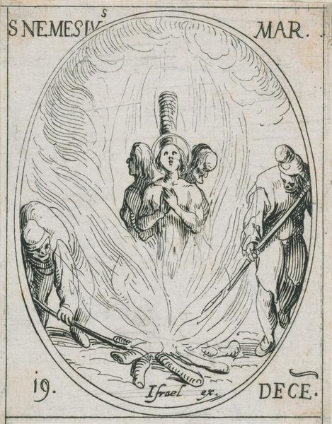 Editor: This is Jacques Callot’s “Saint Stephen,” an etching, although undated. The composition, framed within an oval, depicts the saint’s martyrdom, a rather intense scene. What strikes you when you look at it? Curator: Note Callot's command of line; observe how the density of hatching sculpts the figures, creating volume. How does the artist use the etching technique to differentiate textures, such as the smoothness of skin versus the roughness of the stones? Editor: It's interesting how the angel above contrasts with the violence below. Curator: Precisely. Consider the interplay between the celestial and the terrestrial, and what that might say about the subject’s martyrdom. The etching, in its very structure, creates meaning beyond the narrative. Editor: I see it differently now; thank you for pointing that out. Curator: My pleasure. Visual analysis reveals much about an artwork's power.