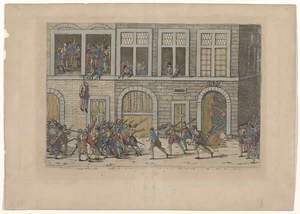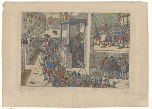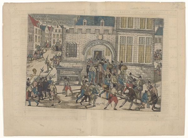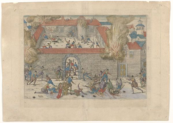 This print, made by Frans Hogenberg around 1576, captures the "Spanish Fury" in Antwerp with stark lines and a chaotic composition. The scene’s architecture, rendered in muted blues and browns, provides a rigid frame for the violence erupting within. Notice how the artist uses linear perspective to draw the eye into the depths of the conflict. The use of line is particularly effective; sharply defining the figures and buildings. The texture of the cobblestone streets contrasts with the smooth, flat planes of the buildings, enhancing the sense of depth. The semiotic system at play here presents a clear narrative: the disarray and brutality reflect a breakdown of social order. The print’s structure invites us to consider how violence destabilizes established meanings, challenging viewers to confront the raw realities of war.