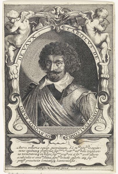 Curator: Welcome. We are standing before an engraving dating between 1610 and 1668, currently residing here at the Rijksmuseum. The piece is titled "Portret van Willem, graaf van Nassau-Siegen" and is attributed to an anonymous artist. Editor: Okay, so my first impression is this: a little heavy, right? Lots of ornate detail packed into a small space. He seems like he's taking himself very, very seriously. I find a surprising warmth in the hatching of the background, even given the severity of his stare. Curator: Precisely! Let’s unpack the elements. The Baroque style is unmistakable. The subject is framed within a complex oval cartouche, topped with a cherubic figure—a very popular iconographic feature during the Baroque era. Notice the strategic use of light and shadow through varied line weights. Semiotically, it suggests wealth and nobility through clothing. Editor: It's also, well, it’s almost claustrophobic. He's crammed into this tiny little frame and overwhelmed by scrollwork. The poor angel up top looks like it's bracing for impact, like "Oh no, he's going to burst out of there!" Also I wonder, an engraving of a powerful man. Is this about preserving a likeness, circulating an image? Curator: Undoubtedly both. Engravings allowed for mass production, and hence distribution of his likeness. His portrayal signifies status and power but engraving as a medium was not an easy or particularly fast medium; hence, choosing this method, while relatively inexpensive, indicates a degree of intended formality and permanence. The sharp delineation reinforces concepts of authority. Editor: It’s interesting. As an artist, I’m fascinated by the limitations and the artist’s ability to turn those constraints into aesthetic strength. I mean look how much information is conveyed, solely using line. A kind of optical dance, wouldn't you agree? A true achievement in its way. Curator: Indeed. The artist's skillful manipulation of line transforms mere medium into meaning itself. So, this portrait, at its heart, isn't simply representational. Instead, it exists as a constructed artifact, steeped in symbolic language and conveying social narratives. Editor: When I consider the emotional tone and sheer craftsmanship I feel like something in this fellow's gaze keeps calling to me, from across centuries. It sparks questions in my soul, makes me think about the weight of legacy. Curator: It certainly offers much for meditation, and that is part of the strength in pieces such as these, they serve almost as philosophical touchstones to engage with.