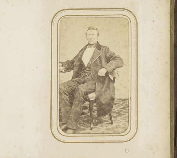 Curator: Oh, there's a contemplative air to this daguerreotype; almost melancholic. The man seems caught in a moment of quiet contemplation. Editor: This is "Portret van een man bij een tafel met boek," created sometime between 1857 and 1864. What we are looking at here is not just a portrait, but a slice of bourgeois life carefully captured in photographic form by Wegner & Mottu, who had a keen eye on social representation. Curator: Slice is the right word! The man with a book--the very image of bourgeois respectability. And he’s rather stylish for it. I get the sense he knows he's being immortalized, which, of course, puts one on one's best behaviour, doesn't it? I wonder what his own relationship to books and knowledge actually was. Did he love them, or was it a prop? Editor: These early photographic portraits served very specific purposes. Daguerreotypes were luxury objects, initially displayed in the home to project status and solidify familial memory. And because they required long exposure times, there was no escaping the fact that getting one's picture taken was itself a socio-economic event. Curator: Yes, but what strikes me now is the patina, that faded amber glow that time gives. It’s the visual equivalent of memory itself. The fragility of the image adds an emotional weight that would have been very different in 1860. He's not a man frozen in amber; the whole scene is amber. Editor: Indeed, that amber tone, as well as the style of presentation in this ornamental border suggests that this portrait existed within an album. Looking at the larger cultural function of these albums within family structures offers insight into victorian social constructs of respectability and private life. And you see such class aspirations embodied so plainly in his confident pose and surroundings! Curator: It makes me think about all the unseen hands that went into creating it – from growing and weaving the fabrics, to grinding the lenses...And the knowledge held by Wegner & Mottu...We have our faces blasted across screens and hard drives; and here is one silvered on glass. Editor: And considered from an even wider angle, consider the power of visual imagery in disseminating new class and aesthetic ideals among a growing middle class; consider its connection to colonialism...These portraits do so much cultural work. Curator: All from one face! That's art isn't it: the small containing the immeasurable? Editor: It really is! Now, to the next treasure.