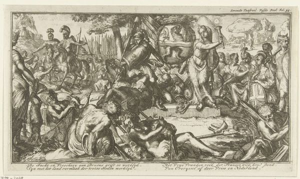 Curator: This engraving, "Bezoek aan een Afrikaanse koning, 1598," which translates to "Visit to an African King," dates from 1617-1619 and is attributed to an anonymous artist. Currently, it resides in the Rijksmuseum. It's executed with incredibly fine lines. What strikes you most about it? Editor: It’s the immediate tension in the composition that jumps out. The clear visual division between the horn-blowing European delegation on the left and the seated, nearly bare-chested African figures creates an instant sense of us versus them. Curator: Indeed, that contrast is quite deliberate. What cultural assumptions do you think the artist brings to bear on the image? The trumpets, the formality of dress—all suggest a very specific approach to diplomacy. Editor: Right, and the presence of the goat, seemingly presented as a gift. It reads as a commentary on cultural exchange that, frankly, feels deeply skewed. Is it offering or possibly something akin to a symbolic exchange related to beliefs or the economy? There is certainly a power imbalance visually highlighted in the scene. The act of presenting a gift or a sacrifice to another authority also plays on colonial narratives in similar accounts. Curator: Looking at it through that lens, I think this goes far beyond a mere depiction of an encounter. Consider the buildings in the background. Do they project what we understand to be seventeenth-century European ideas of "civilized" settlements versus "primitive" dwellings? The settlement is more organized; are these representations of actual events, or projections onto unfamiliar situations? Editor: Precisely. This image becomes less about historical record and more about justifying European presence and interactions through constructed imagery. It invites viewers to read these depictions of African societies through a biased European lens, shaping perception through visuals. I can’t help but question the implied narrative – what’s the power dynamic being portrayed here? Who has the right to chronicle, interpret, and broadcast it? Curator: Yes, you’re speaking about how visual culture at this time becomes instrumental for solidifying identity and constructing narratives about "other" cultures. Editor: Ultimately, the print offers us an early snapshot into how artistic representation contributes to constructing narratives of the colonizer and the colonized. I have found looking closer has just further made me question these accounts as opposed to believing in them as is. Curator: Reflecting on this piece has revealed deeper layers of understanding concerning cultural exchanges and the biases in historical artwork and art's instrumental role.