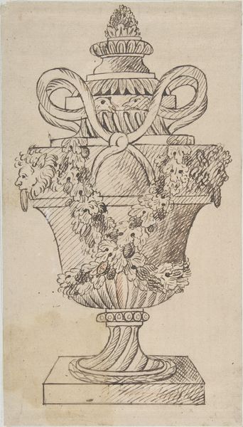 Curator: At first glance, it almost resembles some kind of elaborate key, or perhaps an architectural elevation... Editor: What catches my eye is the pastels, a delicate Rococo palette. A fragile, dreamlike quality hovers about it. What exactly are we looking at? Curator: This is a design drawing by Pierre Moreau, titled "Designs for a Chatelaine and an Etui," created sometime between 1750 and 1777. It currently resides here at the Metropolitan Museum. The artist used pen, colored pencil, and watercolor, so, on paper, to capture his artistic vision. Editor: The title makes it clearer now – a chatelaine and an etui. Practical objects made precious, right? These were status symbols, signifiers of feminine identity in a very particular social stratum. To wear something this ornate telegraphs immense privilege, as Moreau would’ve intended it. Curator: Precisely. The ornamentation goes beyond mere decoration. Consider the floral motifs; they are not randomly chosen. Each bloom carried its own emblematic weight within the language of flowers, echoing coded expressions of love, friendship, and mourning during the Rococo era. Editor: The symmetry is interesting, almost demanding to mirror itself. Yet within this repetition are small shifts and adjustments, making you question where the line between adornment and the practical objects lie. It all blurs into artifice. Curator: I find myself wondering, too, about the 'missing' central panel within each form. Did they contain mirrors, miniatures, or perhaps mementos representing emotional touchstones of the owner's history? What kind of narrative did the patron want this material item to hold? Editor: Considering the turbulent social climate of the period, on the verge of revolution, such exquisite but ultimately useless objects speak volumes about wealth and privilege. Moreau’s artwork preserves more than designs; it preserves cultural anxieties. Curator: Indeed. The careful rendering grants insight into personal aesthetics and shared anxieties. It brings into focus the silent dialogues that were exchanged with symbols through materiality. Editor: Ultimately, Pierre Moreau has captured in ink and watercolor the fleeting values of an era. A ghost in lines and pastel shades.