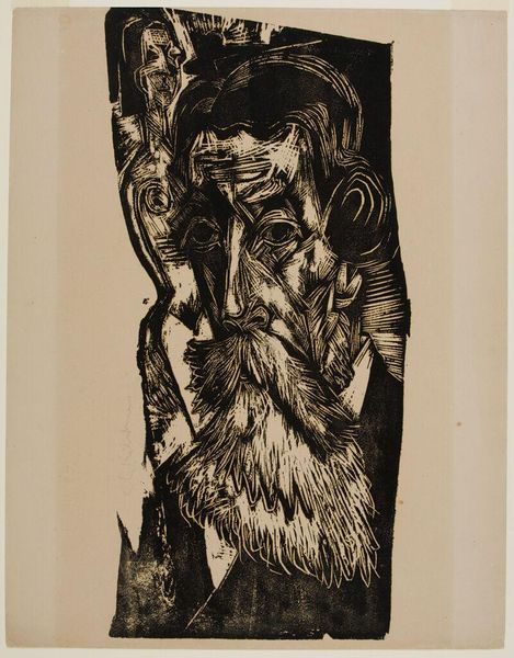 Editor: This is Ernst Ludwig Kirchner's "Alter Berghirte," or "Old Mountain Shepherd," created in 1919. It’s a woodcut print. The harsh lines and deep blacks make the subject seem really worn and weathered. How do you interpret this work, particularly considering the period in which it was made? Curator: The raw emotion in Kirchner's woodcut, so typical of German Expressionism, reflects a society grappling with the fallout from the First World War. This portrait transcends the individual, speaking to the psychological trauma and alienation felt by many. How do the formal qualities – the jagged lines, the stark contrast – contribute to this feeling? Editor: They definitely create a sense of unease. It's like the man's very being is fractured. Is Kirchner using this image to critique something larger than just one person? Curator: Precisely. Consider Kirchner's own struggles with mental health, exacerbated by his wartime experiences. This Shepherd can be seen as an allegorical figure representing the displaced, the marginalized, and those left behind by a rapidly changing world. Does his attire or bearing offer additional clues to his identity and social standing? Editor: I hadn't thought of that. His weathered clothes, they suggest a life of hardship and isolation far away from the city...maybe even outside of society? Curator: Yes, and the darkness surrounding him can symbolize not just physical isolation, but the social and economic marginalization faced by many rural communities during the early 20th century. Seeing the historical context is crucial, do you agree? Editor: Absolutely. I went into this thinking about the art, but not as a commentary of a tumultuous period in German history. Curator: And sometimes that intersection is where art creates a space for dialogue and provokes critical engagement with our world.