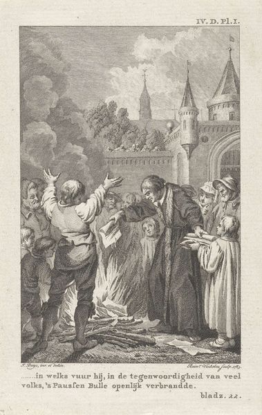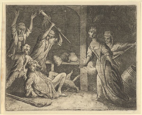Editor: So, this etching by Giovanni David, from 1776, is titled "Iphigenia accompanied by Pylades recognises Orestes, whom she is about to sacrifice." It’s intense, visually! All that classical architecture and those draped figures. The moment depicted is filled with dramatic tension. As a student of art, I’m wondering, what's the deeper context here? How do you interpret this scene through a historical lens? Curator: Excellent observation. Beyond the surface narrative, let's consider the sociopolitical landscape of the late 18th century. The rediscovery of classical antiquity heavily influenced art and thought, acting almost like a mirror reflecting contemporary ideas about governance and power. In this image, what do you observe about how power dynamics are presented visually? Are there hierarchies being suggested by placement or gesture? Editor: Hmm, Iphigenia stands tall, almost regal, despite what seems like a moment of vulnerability. Orestes looks desperate, even chained. So does that illustrate how societal roles can trap people in terrible circumstances? Curator: Precisely! This piece prompts reflections on how individuals navigate predetermined roles. Furthermore, consider where such a work would typically be displayed. Was it meant for private enjoyment within a noble home, or might it have been publicly displayed? Knowing the answer can influence our perception of its intended audience. Editor: I'm thinking that showing it publicly might be a challenge to societal expectations. This kind of highlights tension between personal emotion and political constraints within families and societies. Thank you, seeing the wider history helps a lot! Curator: Absolutely. The power of historical context transforms our viewing. By understanding the art within it’s setting, it transforms our interpretation, even today.