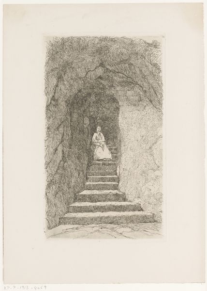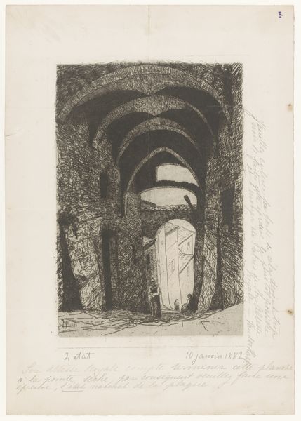 Curator: This etching from 1883 is titled “Poort met gewelven,” or “Gate with Vaults,” by Maria van Hohenzollern-Sigmaringen, also known as Countess of Flanders. It's a striking depiction of a vaulted passageway. What's your initial take? Editor: It's evocative, almost dreamlike. The monochrome and delicate lines create a feeling of depth and timelessness. There is something both inviting and isolating about it. Curator: Indeed, its dreaminess could speak to the broader aesthetic climate. In this period, there's a preoccupation with mood and atmosphere, visible even in landscapes or architectural studies. The piece's shadowy nature prompts questions: What function did such vaulted spaces fulfill? And how might its intended audience respond? Editor: That contrast is key to my experience with the print. While the overall scene has a haunting feel, a figure is seen standing at the end of the passageway, seemingly approaching from the light into shadow. Is that meant to be comforting or cautionary, and for whom? Curator: That lone figure certainly shapes how we perceive this space. Its ambiguous nature suggests it might carry spiritual or religious connotations. It almost becomes allegorical: a passage through time, a transition point... It may point to social attitudes around class and isolation and a yearning to commune across those differences. Editor: Right. By placing a solitary, possibly devotional, figure within the vaulted tunnel, the artist subtly references those enduring power structures in Belgian society. But without any firm evidence about the historical social structures or its reception at the time, how do we confirm the allegory or devotional interpretations? Curator: We can’t entirely. We examine historical and cultural trends, understand this moment's class tensions and its visual language around devotionality, and build our best interpretation from these layers. Consider her lineage within royalty, did this factor into her artistic practice or choice of subject matter? We look for those intersections. Editor: The print certainly makes you reflect on how space influences behaviour, especially in controlled public areas. Curator: Agreed, the artwork remains evocative due to how Maria weaves together architecture, figure, and medium. Editor: It's a piece that asks more than it answers, which, from a historical and art historical position, creates a fascinating case study about visual storytelling.