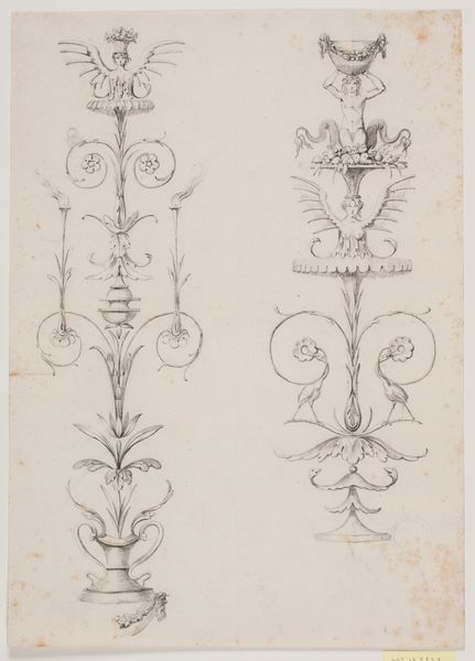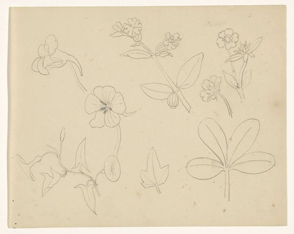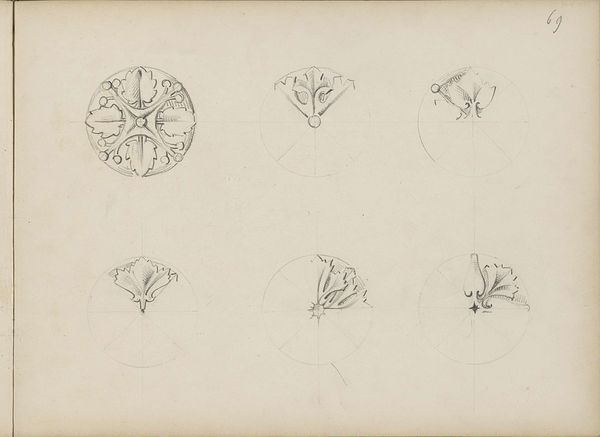 Pierre Joseph Hubert Cuypers made these “Ornamenten met bladeren” drawings with graphite on paper. These aren’t traditional art materials, yet they are practical to convey the inherent qualities of plants and flowers. The drawings showcase Cuypers' acute observation skills, capturing the botanical structures with precision. The pencil lines delineate the forms, emphasizing the weight and texture of the leaves and blooms. The sketches reveal the detailed craftsmanship that would be later translated into various architectural and decorative elements, and a labor-intensive carving work, usually stone or wood. Cuypers was a key figure in the Gothic Revival movement in the Netherlands, often involved with church design. These studies likely served as templates for sculptures within his architectural projects. By understanding Cuypers' design process, we appreciate how his sketches bridge the gap between fine art and craft, elevating functional designs to artistic expressions.