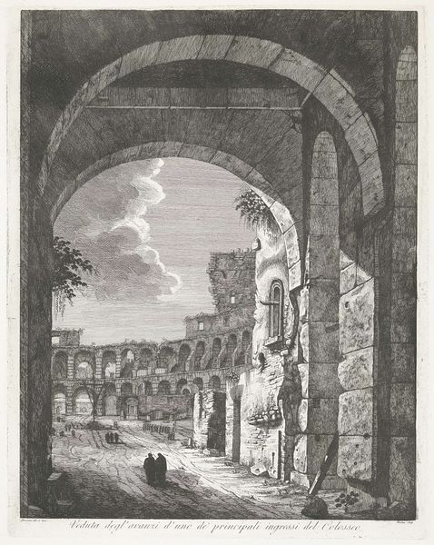Giovanni Battista Piranesi created this etching, "View of the upper storey of the Cages for Wild Animals," using etching. Piranesi lived in 18th-century Italy, a time when the ruins of ancient Rome stood as powerful symbols of both the glories and the declines of empires. His work reflects the era's fascination with classical antiquity, but also its complex relationship with power, decay, and the passage of time. Piranesi wasn't just documenting ruins; he was constructing an emotional experience. Look at the tiny figures against the massive structure, a visual reminder of human insignificance in the face of history. There is a tension between the picturesque beauty of the scene and the disquieting sense of what has been lost. Piranesi uses light and shadow to amplify the drama, drawing us into a space that feels both familiar and alien. Piranesi makes us consider how ruins can serve as a mirror, reflecting our own ambitions, fears, and the ephemeral nature of our achievements.