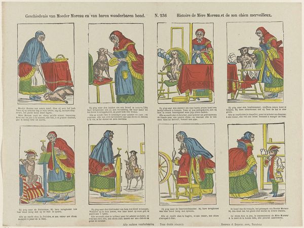 This print, titled "Allerhande koopwaren," was made by Lutkie & Cranenburg, but the specific date of its creation is unknown. It is printed on paper, using what appears to be a woodblock technique. The image is divided into eight vignettes, each depicting a different vendor with their wares—produce, fowl, used clothing, and so on. The rough-hewn lines and flat planes of color speak to the economics of production, emphasizing accessibility over refinement. Note how the texture of the woodblock is plainly visible, especially in the areas of solid color. This is not disguised, but rather embraced as part of the image. The same is true of the simplified figures, whose forms recall folk art. In this way, "Allerhande koopwaren" has a direct relationship to the modes of production, making no attempt to disguise the means of its manufacture. Instead, it celebrates the honest labor of the vendors it depicts, and the humble materials from which it was made.