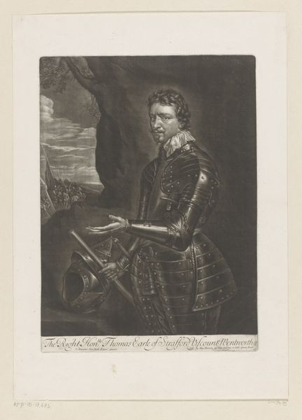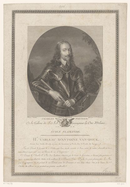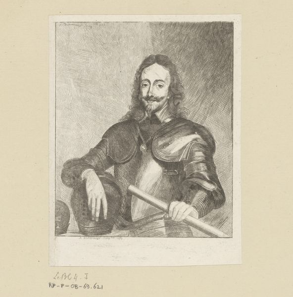 Editor: Here we have Alexander Browne's "Portret van Karel I, koning van Engeland," or "Portrait of Charles I, King of England," created between 1680 and 1683. It’s an engraving, and it's currently held in the Rijksmuseum. The armor looks so detailed for a print. How do you interpret this work, especially considering its medium? Curator: Considering this portrait through a materialist lens, the engraving process becomes significant. We need to think about the labor involved in its production. The engraver, Browne, reproduced an image of the King, democratizing access but also mediating power through a crafted object. The lines, the hatching—these are deliberate acts of reproduction with social implications. Do you think the choice of print over painting was significant in how it could be shared at that time? Editor: That's interesting! It feels almost contradictory, that the portrait of a King, someone of immense power and wealth, would be rendered through a reproducible, and perhaps more accessible, medium like engraving. So, how does the material inform our understanding of Charles's reign? Curator: Precisely! Think about it: an engraving can be circulated widely, fostering a sense of familiarity, but also enabling critique. How would people have consumed this image? Was it framed, pasted into books, or used in political pamphlets? And what does this accessibility do to the image of monarchy and kingship at this time? Understanding the materiality allows us to ask these important questions about production, labor, and dissemination. Editor: That’s a completely different perspective than simply seeing it as a portrait of a king. Considering the printing process, the labor, and how it was disseminated opens up so many possibilities. Curator: Indeed. It moves us away from just aesthetic appreciation to considering the broader social and political context within which this print circulated. Now I’m curious to think about all the political prints that must have circulated in opposition of Charles' reign!