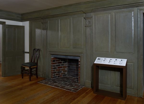 Editor: So, this is a photograph of the Fireplace wall paneling from the John Hewlett House, dating from around 1740 to 1760. The original paneling is at the Met. The blues and reds really strike me. What stands out to you? Curator: The tiling around the fireplace captures my attention. Note the repetition of small, narrative scenes. Consider what these miniature dramas, constantly viewed and revisited, might signify. Editor: Miniatures… so each tile has a little scene on it? What kinds of stories might they be telling? Curator: Precisely. Common vernacular imagery; tales both secular and possibly religious, domestic, all carrying embedded values. Remember that, historically, interiors like these served as stages for expressing wealth, lineage, and aspirations. What feelings do these tiles conjure for you? Editor: A kind of playful elegance, almost? Like serious wealth, but not devoid of character. Were these narrative tiles common at the time? Curator: Indeed. Tilework became fashionable as it spread via increased trading and colonization. Consider this colonial interior as a reflection of these global movements – what’s *really* at hearth, so to speak. How might the original inhabitants have felt surrounded by these recurring images? Editor: Perhaps comforted by familiarity, while still aware of the world beyond. It’s fascinating to think of these as more than mere decoration but also a way to engage with stories, tradition and social messaging on a daily basis. Curator: Precisely. Spaces speak; in every decorative flourish, every arrangement.