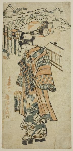 Curator: Standing before us is a print titled "Segawa Kikunojo II as a Girl and Ichikawa Tomiyeimon?", attributed to Ippitsusai Buncho, dating from around 1760-1780. Editor: What strikes me immediately is its delicate quality, like a faded watercolor memory. There’s a hushed intimacy despite the stylization. Curator: Precisely. Observe the linear precision and the deliberate arrangement of forms. The umbrella, a pivotal structural element, dominates the upper register, casting a geometric shadow that intersects with the verticality of the window. Editor: That umbrella...it feels less about function and more like a symbolic veil. Covering what secrets? I love how the figures nearly blend into the patterned backdrop; are they concealing something or are they trying to blend in? Curator: One can analyze the composition through the lens of negative space. See how the void around the figures—a subtly modulated beige—amplifies the contours of their kimonos, accentuating their iconic shapes. The muted palette creates a certain flatness, emphasizing the picture plane. Editor: Flatness yes, but with these hints of bleed and these gorgeous details in the folds. The one on the left with this intricate dress—almost otherworldly— and her face a little too sweet for me. The other seems less amused... like the bearer of hard truths under that ridiculous umbrella. What a contrast between the two. Curator: The artist's use of line—crisp yet nuanced—functions as a signifier of social distinction and codified gesture. The faces, nearly mask-like, serve not as expressions of emotion, but rather as archetypal representations. Editor: Maybe, but I still sense this almost electric tension, like they are a half second from sharing a secret. I am now interpreting that silly umbrella to be protecting both the speaker and the listener, it helps the sharing happen, keeps them unseen and unheard, a portable shell, really. Curator: A provocative reading. Regardless, consider how the formal qualities of the print invite multiple interpretations. Buncho’s strategic orchestration of line, color, and space yields a work that continues to provoke inquiry into the nature of representation itself. Editor: Absolutely. This little peek into what seems like an interaction that may become scandalous or sweet. Or both! A brilliant blend of technique and narrative intrigue. I find myself quite bewitched.