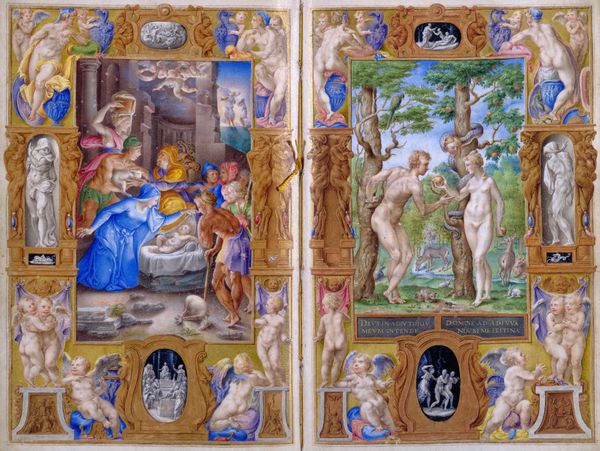 Editor: This is Giulio Clovio’s "Adoration of the Magi and Solomon Adored by the Queen of Sheba," a tempera painting from 1546. The book format gives the artwork a striking presentation. What historical insights can you glean from the combination of these two biblical scenes? Curator: The pairing is fascinating. Clovio sets up a typological comparison popular in the Renaissance: the Old Testament prefiguring the New. Solomon receiving the Queen of Sheba was often interpreted as a precursor to the Magi's adoration of Christ. This comparison elevates Christ, establishing his universal kingship. Do you notice how the architectural and figure styles differ between the two scenes, hinting at their distinct origins and cultural contexts, yet are presented side by side? Editor: Yes, the contrast is really striking now that you point it out. The classical grandeur on the right compared to what appears like more earthly landscape on the left. Curator: Precisely! Consider too the audience for such a work. A private patron, likely wealthy and educated, commissioning a book of hours. Its intricate details and learned iconography speak to an exclusive viewership familiar with biblical narratives and their complex interpretations. What does this reveal to you about the function of art in that historical moment? Editor: It suggests art was both a display of personal wealth and a tool for reinforcing religious and social hierarchies, maybe used during personal devotions. Curator: Exactly. The politics of imagery – who commissions it, who consumes it, and what messages it conveys – are crucial for understanding the historical role and function of art. Editor: I hadn’t thought about the socio-political implications so directly before. Seeing this artwork through a historical lens has really enriched my understanding. Curator: And I have valued the opportunity to share how to view artworks by examining their function, audience, and purpose in society.