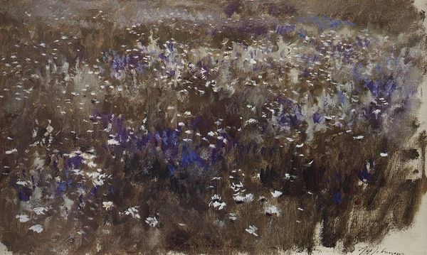 Curator: Let’s take a look at Charles Sprague Pearce's "Wild Flowers," painted in 1902. It's a lovely example of his plein-air work. What are your first impressions? Editor: Well, it strikes me immediately how tactile it seems. You can almost feel the thick application of the oil paint and the roughness of the canvas. I imagine Pearce was working quickly, capturing the light as it shifted. Curator: Absolutely. Pearce was very much embedded in the Impressionist movement, which celebrated these quick, informal studies directly from nature. He received training in Paris and often displayed in the Salons. We might consider how he adapts these aesthetics, while negotiating American audiences, and tastes for landscape art at this time. Editor: And look at the variety of brushstrokes – long, vertical strokes in the foreground giving way to dabs and dashes of colour as the eye moves further into the field. The painting seems less concerned with precise botanical detail and more about the process of rendering light and colour. I'd love to know where he sourced his paints and brushes from. Curator: It does blur the boundaries between representation and pure abstraction. What is perhaps most compelling is how this canvas captures a moment, rather than a literal place. These meadows represent an increasing cultural preoccupation with idealizing a romantic notion of leisure time within idyllic pastoral settings. Editor: Yes! It hints at broader shifts within material culture and notions of “free” labor. Consider also that each dab of colour is created through labor itself: the paint created by grinders; the brushes stitched and sewn. It really invites us to look closer at what constitutes labour, artistic and otherwise. Curator: A fitting way to end our reflections today. I agree it presents itself as a casual painting but implies complex histories and socio-economic implications that ask more from its viewers. Editor: Indeed. It certainly pushes you to consider the making of a world, and a work of art, simultaneously.