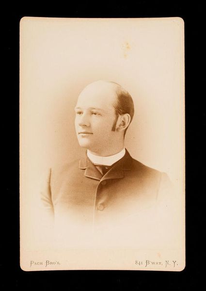Curator: This is a photograph of Frederic Shurtleff Coolidge, who died in 1915, taken by Pach Brothers. It's a cabinet card, a popular format at the time. Editor: The sepia tones lend a distinct air of nostalgia. Notice how the soft focus emphasizes his profile, creating a dreamy, almost ethereal quality. Curator: Pach Brothers were a prominent photography studio, particularly known for portraits of academics and public figures. Coolidge’s family connections likely placed him within their clientele. Editor: The diagonal lines formed by his jacket and tie create a subtle dynamism against the plain background, drawing the eye upwards. Curator: These portraits served as important markers of social status and professional achievement. They were often displayed publicly or circulated among social networks. Editor: I see that the image seems to capture a moment of poised self-reflection. It would be lovely to study it in greater detail, and analyze other examples from the Pach Brothers studio. Curator: Indeed, the photograph provides a window into a bygone era and the social values it upheld.