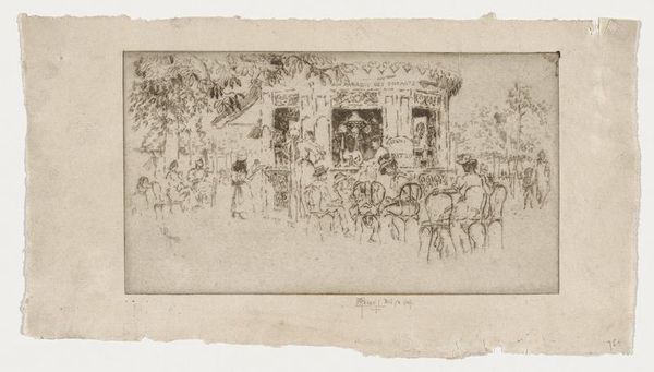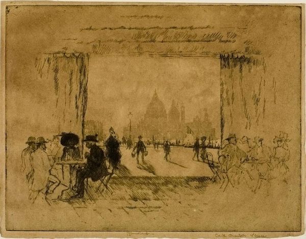 Curator: This etching by Joseph Pennell, called "Café Orientale," was created in 1911, capturing a scene in Venice. You immediately feel the shimmering heat radiating off the Piazza, don't you? Editor: Absolutely, and beyond the visual heat, I sense a socio-economic temperature. Venice, even then, existed as a stage for consumption. It feels undeniably bourgeois. I immediately key into who gets to casually "be" in this space, and who is facilitating their leisure? Curator: Oh, that's interesting. I was just caught up in the almost ghostly impressionistic quality—the way the lines seem to dissolve into the air. Pennell was so enamored with light. Look at the dome in the distance, how it almost dematerializes into a halo. Editor: Light, yes, but look at those dark, almost violently etched lines delineating the figures in the foreground. Pennell's capturing not just a cafe scene, but class stratification. The bodies pressed into service are just as ghostly as the basilica if you fail to really "see" them. Curator: I suppose. Although he seemed less interested in overt political statements and more invested in portraying the dynamism of urban life and architecture... his cityscapes thrummed with a kind of energy, the rush of modernity. Editor: Agreed. Pennell gives us a glimpse into the making and maintaining of leisure for some, at the cost of others. These "cityscapes" were, and are, shaped by uneven access, power, and privilege. Curator: Well, either way, "Café Orientale" prompts us to look closer. Perhaps art helps us practice slowing down, perceiving things we might otherwise rush past. Editor: Exactly, and when it works best, also prompts a broader examination of the complex forces shaping not only what we see but the unseen costs beneath.