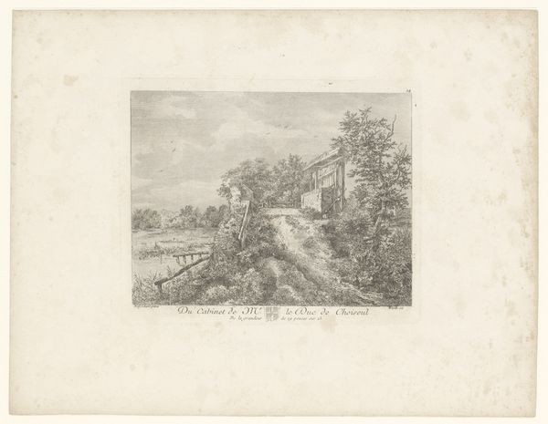 Curator: Petrus Josephus Lutgers invites us to contemplate “Gezicht op vijver en buitenplaats Elswout”—that’s "View of the pond and Elswout estate"–created through etching and printmaking methods sometime between 1837 and 1844. Editor: Immediately, the subdued grayscale lends a wistful, almost dreamlike quality. The mirrored surface of the pond amplifies that feeling. What details stand out to you as evocative? Curator: Notice how the architecture, while present, is quite recessive; nature dominates. The landscape here doesn't simply decorate, but becomes a symbolic container of cultural memory. Consider the Dutch Golden Age landscapes—the formal country estate situated amid sprawling wilderness speaks to cultivated order, suggesting a humanist reverence. Editor: I'm curious about the actual labor involved in producing this image, turning observation into repeatable form. Etching allowed for the precise layering of line and tone, mass-producing imagery for broader consumption. Do we know what paper was employed? It seems substantial for mass distribution. Curator: The paper would have indeed been deliberately chosen—not just for its physical properties, but as a marker of quality and intended audience. Consider the symbolic weight carried by the location: Elswout Estate, with its history and associations, adds depth to our understanding of its representation. The careful orchestration of elements communicates power and prosperity. Editor: Definitely; this level of craft required immense skill—a collaboration of man and material that elevates mere document into an emblem of idealized, controlled nature. It's more than simply a beautiful image. It’s also a representation of resources and power in landscape. Curator: And that power extends beyond the merely visual. Consider the legacy, too. Its imagery has informed and shaped how the Dutch conceive of their environment for decades. These symbols persist. Editor: A fitting observation—one final aspect for reflection: that combination of practical labor meeting conceptual expression leaves a layered impression regarding the social forces, physical resources, and hands-on craftsmanship needed to achieve something simultaneously artful, lasting, and deeply encoded.