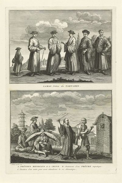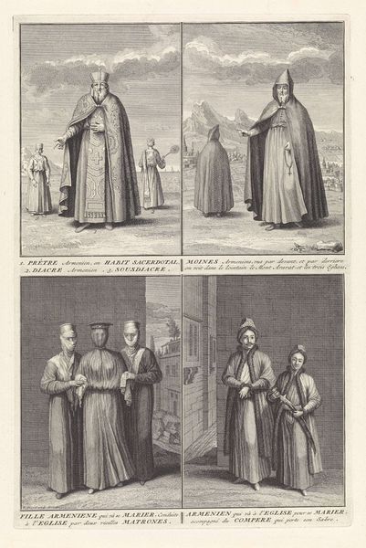 Bernard Picart created this print, "Clerics in the Greek Orthodox Church," in the early 18th century, using etching to produce a work rich in detail and texture. The composition is divided into four distinct panels, each presenting figures within their specific environments. The use of line is particularly striking. Delicate, precise strokes define the contours of the figures and their garments, creating a sense of depth and volume. Light and shadow are rendered through intricate cross-hatching, adding a tactile quality to the print. The arrangement of the panels invites a comparative analysis. Each setting, though different, shares a common formality, a structure that speaks to the hierarchy and order within the church and society. Picart's print acts as a sign, encoding cultural and social meanings through its visual presentation. It invites us to consider how representation is not merely a reflection of reality but a structured construction that communicates specific values and beliefs.