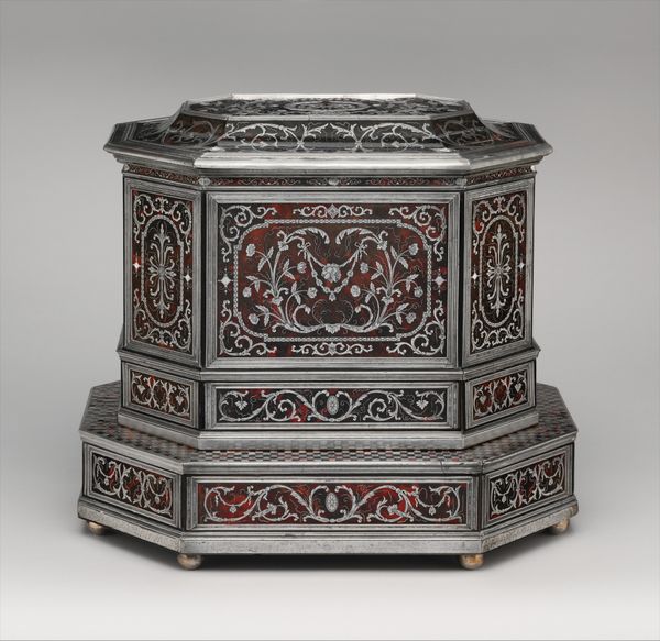 This anonymous Storage Chest captivates with its calculated geometry and rich materiality. The contrasting dark wood and iridescent mother-of-pearl create a striking visual effect. Notice the intricate patterns—octagons, diamonds, and triangles—each meticulously inlaid. These shapes create a sense of order and balance, yet the slight variations in the material introduce a subtle tension. The anonymous artist plays with symmetry, dividing the surface into distinct fields of ornamentation. The juxtaposition of geometric precision and organic variation destabilizes any singular reading. Consider how these formal choices engage with broader cultural codes. The geometric patterns and the use of precious materials evoke ideas of luxury and status, while the overall symmetry suggests a deeper philosophical quest for harmony. This chest invites us to reflect on the relationship between form and function, aesthetics and ideology, in the realm of decorative arts.
