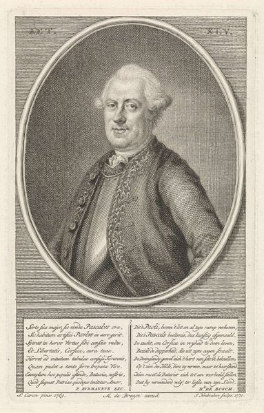 Curator: We’re looking at an engraving from 1784 entitled "Portret van Jan Jacob Elsevier," attributed to Reinier Vinkeles. It’s a meticulously detailed portrait. What's your initial read of it? Editor: I’m struck by the sense of contained power—a certain stateliness framed by stone and symbolic objects. There's a gravitas communicated in every line. Curator: The oval framing is interesting, isn't it? It mimics the shape of a classical cameo. This device serves to elevate the sitter, Jan Jacob Elsevier, imbuing him with a timeless quality and also acting as a form of classical artistic referencing. It creates an architectural stability to contain a portrait. Editor: Absolutely. Elsevier, given his titles etched beneath his likeness, council member and colonel of Rotterdam, seems acutely aware of his status. Even his slightly asymmetrical gaze invites confidence but also demands deference. I notice a mace resting prominently—is that a symbol of civic or military power? Curator: Precisely. It visually affirms his authority as the engraving immortalizes him, ensuring both present viewers and posterity recognize his significance. Notice also the lion motif beside it—that references strength. Editor: Yes! The lion coupled with what looks like heraldry suggests a narrative rooted in historical, perhaps even familial, symbolism of Dutch values. Also, that hat on the table indicates the position of an elite within Dutch society. Everything emphasizes a conscious performance of power and authority. Curator: And how Vinkeles executes this! Observe the contrast between the textures--the smoothness of Elsevier's face against the elaborate curls of his wig, or the defined detail in the lion emblem, versus the smoother stonework. All done solely through linear mark-making, emphasizing light and shadow. Editor: What I appreciate is the layering of symbols; the piece does not settle with portraying only the figure, but instead provides several artifacts relating to who he was, what he stood for, and ultimately his role in society. This offers layers of meaning which, in combination, reinforce the impression that he’s an accomplished civic and military person. Curator: Agreed, the piece utilizes careful design, perspective, and symbol-set to make a solid representation. It delivers, without fail, on a specific societal moment, attitude, and value system. Editor: Indeed. This portrait freezes not only Elsevier’s likeness, but the entire system propping him up. Thank you, a revealing discussion!