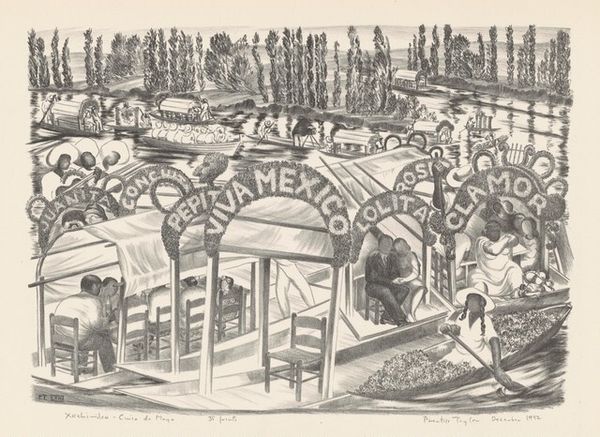 Editor: This is "Gostiny Dvor," a pen and ink drawing created in 1921 by Boris Kustodiev. It feels really busy, almost chaotic, but also kind of dreamlike with the sketchy lines and the strange combination of imagery. What do you see in this piece, from a more formal perspective? Curator: Precisely that sense of "busyness" which arises, I think, from the incredible density of line. Note how Kustodiev employs hatching and cross-hatching, not to render volume necessarily, but to create a surface tension. Consider how this all-over mark-making serves to flatten the perspectival recession we might otherwise expect in a cityscape. Are we truly drawn *into* the Gostiny Dvor, or kept *on the surface* of the image? Editor: That's interesting. It does feel like I'm looking at a wall of imagery, not necessarily stepping into a real space. Does the flatness emphasize the different planes? Curator: Yes. Note the interplay between the architectural frame, the signage, and the figures populating the scene. Kustodiev creates separate picture planes within the whole, which destabilizes any coherent spatial reading. The high vantage point also compresses space. The effect isn't depth, but a dense tapestry of urban life rendered as a graphic composition. Do you notice other areas in which this happens? Editor: I see it near the top, how the painting or mural of the landscape flattens against the image of the icon. That is echoed throughout the piece. Curator: Exactly. So while a traditional reading might look for depth and realism, here the power resides in the denial of those very qualities, favoring instead a constructed and consciously artificial rendering of the world. Editor: I see it now. Instead of trying to capture reality, the artist seems to be building an image from pieces. It's less about the place itself, and more about Kustodiev's graphic sensibility and technique. Curator: Precisely. And through the work’s meticulous application of form, the picture constructs meaning through and via those applications, challenging any easy connection to reality.