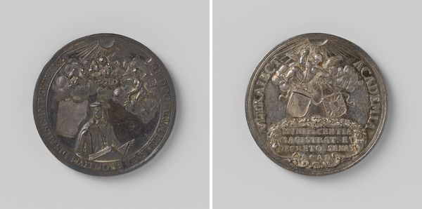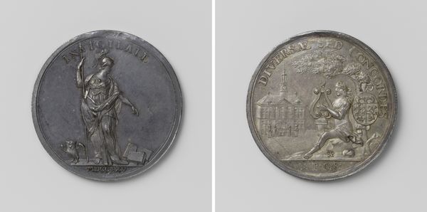 This silver medal was created by Johan George Holtzhey. The artistry lies in the manipulation of metal, a medium prized for its durability, but requiring immense skill to transform. Holtzhey, as a medalist, would have employed techniques like die-striking to impress designs onto the silver. The medal’s imagery, on one side, displays a captain handing out medals to his company, while the other shows military accoutrements. These scenes were likely first engraved in hardened steel, and then used to stamp multiple versions onto softer silver blanks. This medal is not just about commemorating military preparedness. It embodies the social dynamics of the time. Medals like these were often commissioned by civic groups, guilds, or even military units as symbols of membership, achievement, or allegiance. The medal is a testament to a system of reward, recognition, and the social structures that bound communities together. By considering its material and process, we can appreciate how this small object offers insight into the world of 18th-century Dutch society.