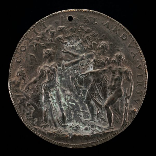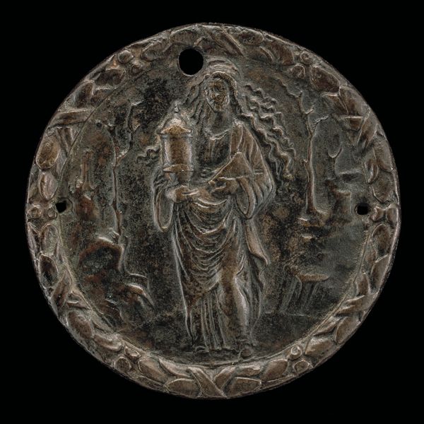 This is a medal, cast by Francesco Laurana, its date is unknown. At first glance, one notices the circular form, characteristic of medals, which immediately frames the allegorical scene. The composition is dominated by the figure of Peace, standing tall in the center. Note how Laurana juxtaposes symbols of war and peace: the discarded helmet beneath her, countered by the olive branch she delicately holds. The use of relief is masterful. The varying depths create a sense of space within the limited circular field. Consider how the rough texture of the metal surface contrasts with the smooth, idealized form of Peace, highlighting the tension between the ideal and the real. The materiality of the medal itself—its weight and texture—serves as a constant reminder of the physical world, even as it represents abstract concepts. This medal, in its structure and symbolism, invites us to contemplate the fragile balance between conflict and harmony, challenging us to consider the conditions necessary for lasting peace.