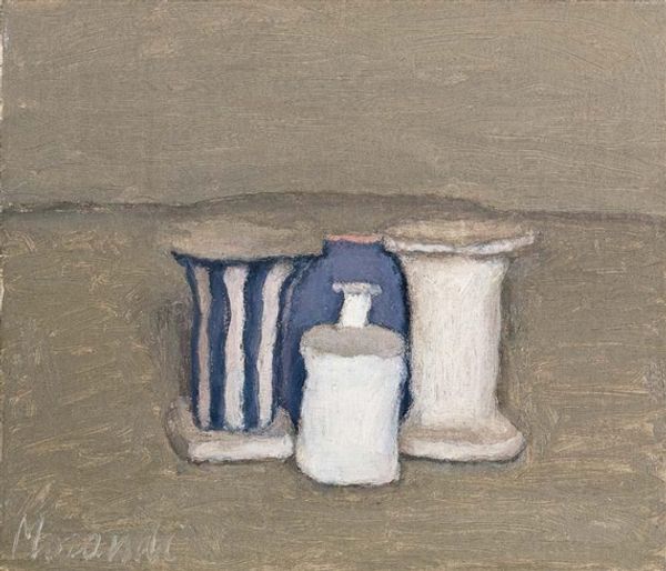 Giorgio Morandi made this still life, called 'Natura Morta', with oil paint. Look how the paint has been dragged across the surface, and how the colours are muted and greyed out. What a process! It's almost like he's trying to figure out what these objects *are* by painting them, not just copying what he sees, but finding out what they *mean* to him, through painting. I love the way the colours feel like they've been toned down. The surface has a rough feel from the brushstrokes. There is something about the colour and texture that gives the painting a melancholy feel. See how the edges of each object aren’t sharply defined, they seem to melt into one another and into the background, like they are all part of one big family. I am reminded of Agnes Martin, or even some of the early still lifes of Picasso or Braque. There are no definitive meanings here, just a quiet, ongoing exchange of ideas.