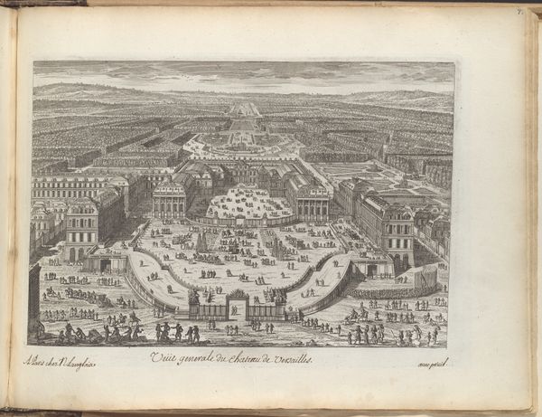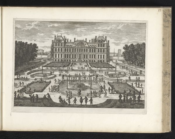 Curator: Adam Perelle, with this delicate etching entitled “View of a Castle,” transports us back to a time of grand estates and meticulously designed landscapes. It was made sometime between 1613 and 1707, placing it firmly within the Baroque period. What’s your first impression? Editor: The overall impression I get is one of carefully curated power. It's not just a depiction of a beautiful building but a visual representation of authority and control, with its structured gardens and imposing architecture. Curator: Exactly! It feels so staged, doesn't it? Even the little figures scattered about seem positioned for effect, like players in a grand tableau vivant. I wonder what stories they could tell if only they weren’t frozen in this pristine tableau? Editor: These "frozen" moments are precisely what the artist intended; it projects permanence and wealth. Consider who this artwork was for, during the rise of absolutist states, it served to legitimize hierarchies that demanded strict rules and lavish spectacles. What is captured is not an actual moment, but the ideal the artist wanted to embody in this setting. Curator: Yes, the artifice is practically breathing here, like a tightly laced corset. But there’s something else, a whisper of something untamed trying to break through. Notice the hills barely visible on the horizon – a reminder of the world beyond the castle walls. Editor: Interesting that you mention what lies beyond. One can also argue that this visual emphasis on the building and the surrounding space was created through colonial exploitation. In short, the art serves as an exercise in landscape appropriation. It begs us to consider questions about labor, resources, and social extraction. Curator: True, it does offer that uneasy feeling that this grandeur may come at a cost. Still, I get drawn into the pure imagination on display, this urge to reshape the world into something utterly perfect and artificial. What a quintessentially baroque desire. Editor: Precisely; in seeing the staged reality, one recognizes both the intent to idealize and the means necessary to do so. Curator: Looking at the work, the tiny scale, the meticulous detail…it does get me thinking about the human condition. Editor: It certainly is an engaging commentary about people's ambition!