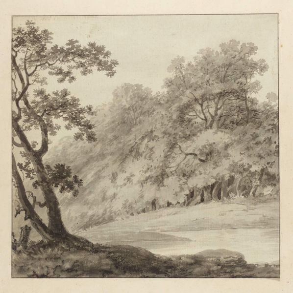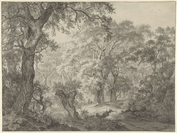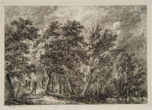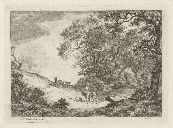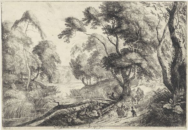 Curator: Before us is Ignatius van den Stock's etching, "Landscape with Travelers in a Wood," held at the Harvard Art Museums. Editor: It’s a study in contrasts – the dark, dense foreground gives way to a hazy, almost ethereal background. The composition is divided almost in half. Curator: The composition draws on established visual tropes of journey and passage, from darkness to light. Note how the figures, rendered with such fine lines, are diminished by the looming trees. Editor: The use of line is quite remarkable. See how the delicate etching creates different textures, from the soft foliage to the rough bark? It's a masterclass in tonal variation using a single color. Curator: The woods represent a space of transformation and the unknown – such landscapes frequently appear in folklore, symbolizing hidden dangers, but also opportunities for self-discovery. Editor: It's interesting how the artist balances precision with ambiguity. The lack of stark lines allows the landscape to breathe and invites the viewer to imagine their own narrative within it. Curator: The act of traveling through this wood speaks to a deeper human experience. The travelers are everyman figures, embarking on a journey that echoes our own. Editor: I appreciate how this little etching manages to create such a palpable sense of depth and atmosphere. A powerful example of how less can be more in the hands of a skilled artist.