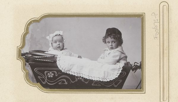 Curator: This gelatin-silver print, entitled "Portret van twee zittende baby's in witte jurken," or "Portrait of two seated babies in white dresses," is attributed to Josephus Hendrikus Petrus Coppens and dates from approximately 1889 to 1925. What are your first impressions? Editor: Brooding. It’s remarkable how powerfully their serious expressions convey something about the era. The contrast between their stern gazes and the delicate lace and fluffy texture beneath them creates a captivating tension. Curator: Indeed. Notice how the composition emphasizes symmetry. The positioning of the babies, their garments, even the subtle framing within the photograph itself contribute to this structured mirroring. Observe also how Coppens uses light to define the subtle contours of their faces, achieving an almost sculptural quality. Editor: That formal rigidity feels at odds with the image we might expect of babyhood. The white dresses are symbolic of purity, innocence, but here, set against those expressions, they suggest fragility, vulnerability, even loss. Is it simply a desire to immortalize or perhaps something deeper about the role of the family in Dutch culture at the time? Curator: A compelling interpretation! One could certainly examine this image through the lens of historical anxieties regarding mortality and the preservation of legacy. But on another level, I'm struck by the visual balance, achieved not only through symmetry, but via gradations of tone. Editor: Perhaps. I cannot shake off my reading though that the very controlled setting is suggesting a statement of family. It is saying “We made it", with clear symbols on mortality present in that message too. Curator: A potent convergence of form and symbol, reflecting perhaps a uniquely vulnerable yet stoic historical moment captured in a photograph. Editor: Precisely, an indelible mark. A picture speaks a thousand words and makes you look at its story every time.
