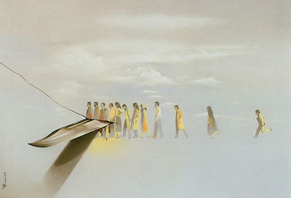 Siegfried Zademack made this painting, Für jeden ein Stück, with careful and very soft applications of oil paint. The smooth surface and hazy lighting give it a sort of dreamlike quality, as though we’re seeing something not quite real. I think of it a little like a fresco, not in terms of the medium, but how the hazy muted palette and indistinct forms seems to emerge from the depths of the surface. Look at the gestures of the figures. They are all involved in the repetitive action of drawing, or maybe they're writing, in the sand. The figures are all identically dressed in white robes. They bow to their work. In the background, the forms fade into the haze. The circles and lines are so delicate. It’s like an exercise, a form of meditation. It reminds me of Agnes Martin’s grids, in the way that it uses repetition and subtle variation to create a feeling of calm and contemplation. It also makes me think of Hilma af Klint’s symbolic paintings, with a similar sense of mystery. Maybe it’s also a bit like Giorgio de Chirico, with its strange and unsettling atmosphere. In the end, it’s up to you how you interpret it.