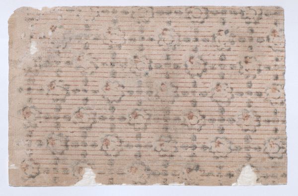 Editor: Here we have "Chinz Fragment" dating back to the 18th century. It is a cotton textile piece, currently residing here at the Minneapolis Institute of Art. The golden patterns really pop against that ochre ground! How would you interpret the arrangement of these golden embellishments? Curator: This fragment offers a compelling study in surface design. Note the interplay between the ochre field and the applied golden motifs; their regularity establishes a rhythm, yet the fragment's edges disrupt a sense of predictable repetition. Consider how the use of textile, with its inherent grid-like structure, influences the perception of pattern. Editor: It’s fascinating how that tension is built into a seemingly simple design. Do you think the fragment’s incompleteness influences how we read its patterns and shapes? Curator: Undoubtedly. The raw edges deny a complete reading, challenging the viewer to imagine the textile’s original scope and purpose. The surviving portions, especially the golden details, assume increased importance. Focus on the quality of these: how does the application of gold leaf, or possibly metallic paint, affect the overall texture? What feeling do you perceive from this choice of material? Editor: There is a tactile feel—it feels very rich, despite the fragment being incomplete. What do you see as its strengths compositionally, outside of just its ornamentation? Curator: It cleverly employs a structural foundation to explore pattern recognition, forcing our eye to bounce around to visually resolve figures. We observe that the integrity of the grid gives structure while still creating a composition which is not excessively formal. The deliberate lack of rigid uniformity lends dynamism to the structure and promotes deeper consideration of color. Editor: That makes so much sense when you describe it in terms of a structured but evolving grid. Now I’m seeing so much more. Thanks! Curator: I find myself returning to its materiality, a tangible thread to its era. There's value in considering what’s been lost and what remains—it truly encapsulates the aesthetic concerns that underpinned this type of 18th century Chinz fragment.