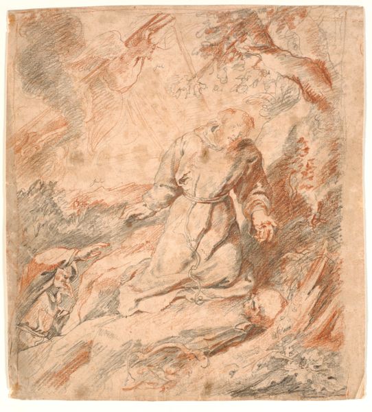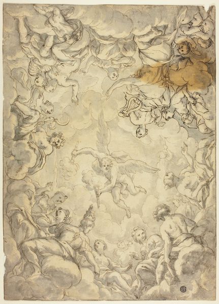 Editor: This is Michel François Dandré-Bardon’s "An Allegory Comparing Music and Poetry," created in 1740, using ink on paper. There's this swirling mass of figures, all rendered in reddish-brown ink, creating a rather dreamlike, ethereal composition. What compositional elements stand out to you? Curator: Immediately, the lack of stark value contrast is apparent; it softens forms within a unified visual plane. Dandré-Bardon utilized tonal gradations achieved through varied ink washes to sculpt forms. Note the deployment of linear perspective as a symbolic scaffolding in the background that recedes but ultimately lacks three-dimensional grounding. How does this absence affect the work? Editor: It makes it feel less about realism and more about...ideas. It's not a scene to be believed, but a concept illustrated, perhaps? It directs my reading toward interpreting symbolism in this context rather than a conventional representation. I suppose you might consider that intentional? Curator: Indeed. Observe how the dynamism in the line work suggests movement and energy. Consider the implications of semiotics within this space. Each symbol or form creates a network of meaning relative to the other through its spatial positioning. Note the organization; from chaos below, where an agitated and enthroned beast is pictured, forms arise that create, eventually reaching, equilibrium with an ascending Pegasus, suggesting a structured progression toward... Editor: ...harmony, perhaps? The symbolism then reinforces that reading: The beast chained becomes humanity refined by art? Curator: It's plausible, given the classical artistic lexicon employed, but we must always return to the formal elements—the relationships between line, tone, and the artist’s strategic utilization of space. That’s where our analyses and understandings become visible. Editor: That clarifies things. The linear development guides the viewer's journey. Curator: Precisely! It enables us to discuss the relationships and inner construction that shapes any work. We can consider any historical intention separately, but we read visual organization itself most immediately.