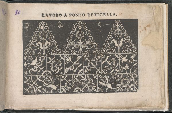 Curator: Here we have a page, specifically page 21 recto, from Isabella Catanea Parasole's "Pretiosa Gemma delle virtuose donne," created around 1600. It is an engraving, now held at the Metropolitan Museum of Art. What strikes you immediately? Editor: It looks like blueprints for another dimension's garden. Stark, intricate… a little intimidating, like peering into a highly organized, alien world. All that stark geometry and then these weirdly organic floral shapes tangled up within. Curator: Indeed. Note how the composition utilizes a grid, dividing the space into a series of squares and triangles. Within each module, we find meticulously rendered geometric patterns interwoven with stylized floral motifs. This exemplifies a key element of formal Renaissance design. Editor: Absolutely. It's that contrast between hard, defined lines and these almost dreamlike natural elements that pulls me in. And the sheer density—every millimeter seems occupied by some pattern or shape. Do you think it was a study for needlepoint or lace? Curator: Precisely! The title itself gives us a clue, referencing "lavoro a ponto reticella," a type of needle lace popular at the time. These designs were intended as templates, offering virtuosas models for their own creations. Observe the elegance of line and the rhythmic repetition of forms; principles highly prized during the Italian Renaissance. Editor: So, women looking at this page imagined it rendered in thread? It gives it a curious tension, a feeling of potential, like un-spun stories waiting to happen, tiny narratives you can wear. And this page being part of a book elevates its significance; beyond craft, this symbolizes education and sophisticated female artistry in the 17th Century. Curator: A cogent point! Moreover, let us appreciate how Parasole, as a woman artist, successfully navigated the patriarchal structures of her era by creating works that both catered to and celebrated the artistic talents of women. The book and its prints served a dual purpose: instruction and, simultaneously, the advancement of women's roles within artistic spheres. Editor: Well, when I see something like this, I feel a little burst of rebellious, crafty inspiration! Maybe a whole quilt… with little hidden messages stitched in! Or is that getting away from Parasole's original, more refined vision? Curator: On the contrary, it demonstrates how art transcends time and form to invite new visions. It shows this was never merely functional; these patterns echo into futures unknown.
