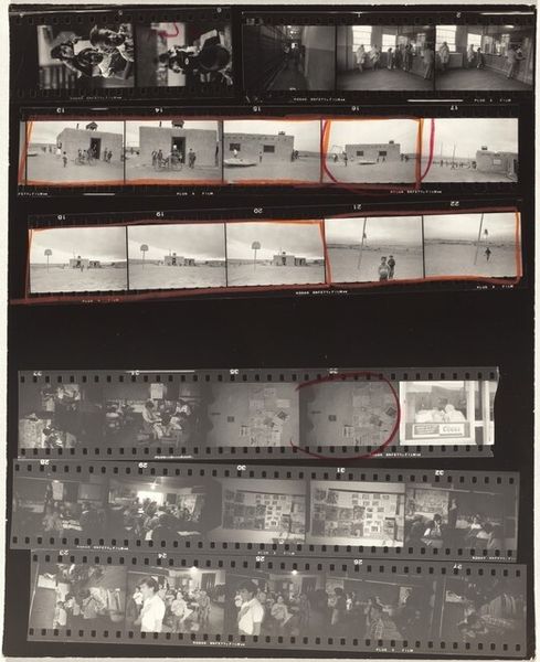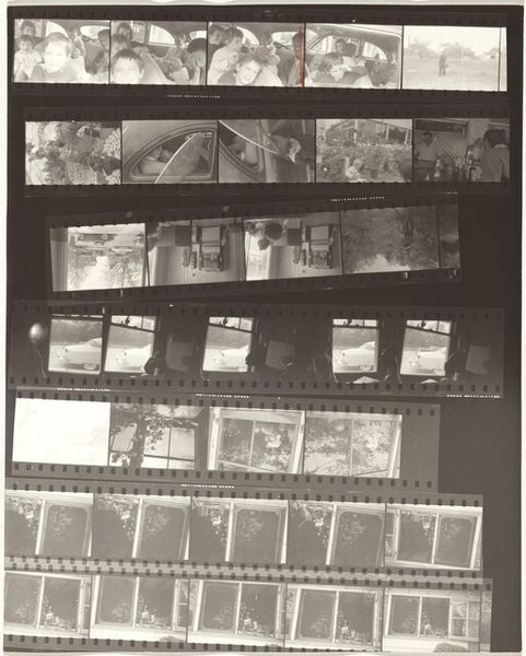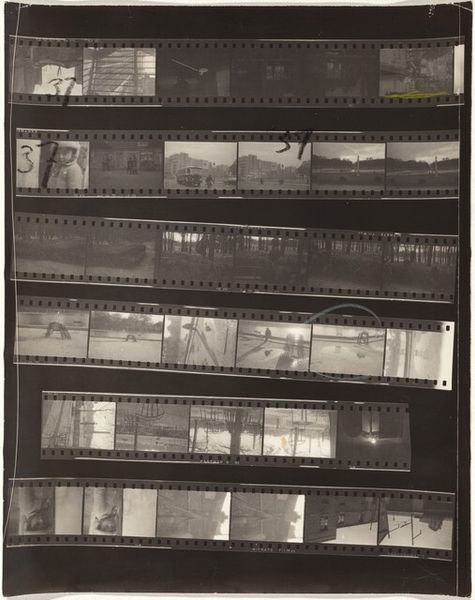 Editor: Robert Frank's "Vienna--Early Europe 1" from 1949, captured on a gelatin silver print, really throws me back. It's like rifling through someone's memories, seeing Vienna in grainy black and white. But the contact sheet format! What's your read on this piece? Curator: I love that "rifling through memories" bit. It resonates, doesn’t it? For me, Frank isn't just documenting Vienna, he is hinting at stories *within* stories, that pre-war European sensibility juxtaposed against this emerging post-war anxiety. The contact sheet is deliberate, raw. What jumps out to you when you look at the series of frames presented this way? Editor: That raw quality, absolutely! Seeing the Ferris wheel, then fragments of faces and streets…it feels like catching fleeting moments, nothing staged. It’s restless, almost unfinished. Is it fair to see this almost as a rejection of the perfectly posed portraits of the time? Curator: Precisely. Frank bucks that trend, seeking truth in the in-between spaces. These are visual fragments forming a city's DNA, a rejection of glossy portrayals, yes, and a lean into the messy beauty of reality. He is playing with reality. Did you notice how he grouped images? Any groupings that catch your eye? Editor: Definitely the Ferris wheel series – that repetition almost creates a sense of dizzying circularity, a kind of hopeful symbol caught in a loop? But there's also this pervading sense of melancholy hovering throughout... Curator: Melancholy tinged with possibility - I love that. By framing the city in fragments, he's framing a moment teetering between what was and what might be. Now you know what I mean about that ‘story within stories’ element, right? Editor: Yeah, each little frame hints at an entire world unseen. It’s incredibly powerful. Thanks for unpacking that with me! Curator: The pleasure's all mine. Now, go find your own Vienna, capture its DNA and weave *your* stories into being!