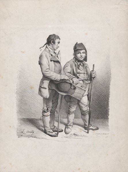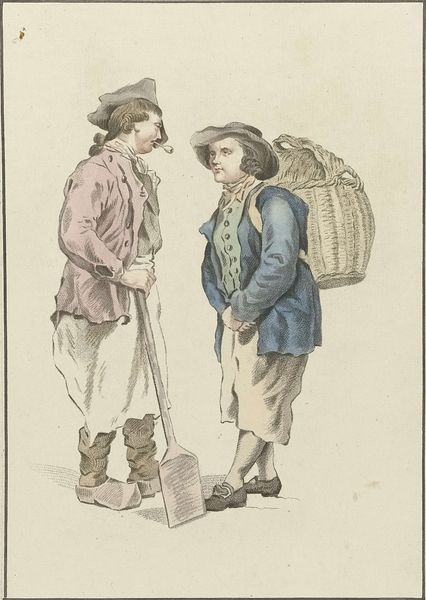 Mathias de Sallieth created this print, titled "Twee boeren in gesprek," sometime in the late 18th century. It offers a glimpse into the lives of rural workers during a period of significant social and political change. The figures are rendered with a sense of realism that invites viewers to consider their daily existence, their labor, and their social standing. Notice the details in their clothing and tools, revealing elements of class and occupation in the pre-industrial world. This work reflects the broader artistic interest in depicting everyday life, but does it also romanticize the labor and social dynamics of rural life? Through this image, we're encouraged to think about the lives of those who may not have had a voice in broader society, while also wondering about the artist's perspective on these individuals. De Sallieth’s print captures a quiet, perhaps idealized, moment that sparks reflection on the lives of ordinary people during times of change.