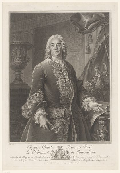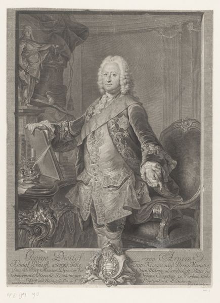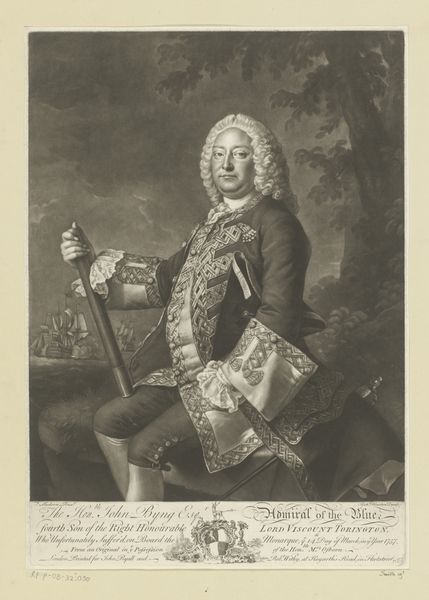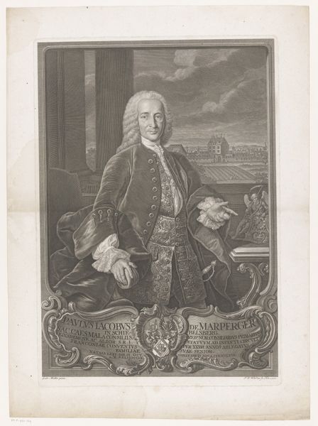 This is Georg Friedrich Schmidt's portrait of Henry Voguell, made with etching, engraving, and drypoint. This image reflects the social and economic structures of 18th-century London, and it’s a compelling example of how art served to affirm the status of the city's merchant class. Voguell, identified as a London merchant, is depicted with symbols of wealth and status, such as his elaborate wig, finely tailored coat, and ornate cane. In the background, we see ships, alluding to his profession, international trade. The setting is classical, with a column and an aristocratic landscape, yet it is combined with images of manufacture, trade and industry. The coat of arms lends Voguell a mark of nobility. Understanding this portrait requires knowledge of the economic history of London at the time, especially the role of merchants in the city's growth and global trade networks. Research into the Voguell family and the records of London's merchant guilds could reveal more about the social context of this portrait.