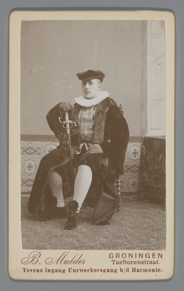 Editor: This photographic portrait, created between 1886 and 1897, presents an unidentified student from Groningen dressed in a striking masquerade costume. It's fascinating how the monochromatic tones enhance the textures of the fabrics and the almost theatrical setting. What stylistic choices stand out to you? Curator: Focusing on the purely formal aspects, observe how the photographer has carefully arranged the composition. The subject is centrally positioned, flanked by furniture whose dark tones and rectilinear geometry act as a backdrop, accentuating the texture of the costume. What impact do you think this symmetry achieves? Editor: The symmetry creates a sense of formality, a balance. But doesn’t the somewhat playful costume disrupt this rigidity? Curator: Precisely. This contrast is important. It introduces tension, forcing a deeper inspection. The student's garments—notice the puffed sleeves and elaborate ruff—display complex tonal variations in greyscale. This contrasts significantly against the relative uniformity of the set pieces and the individual. Editor: It also makes him seem more lifelike, three dimensional. Almost sculptural in a way. Curator: Indeed. How the light interacts with those textures creates subtle yet noticeable visual patterns, forming rhythms which guide the viewer’s eye. What conclusion might we draw about the photographer's intent, given the compositional choices? Editor: Perhaps to showcase the texture and the richness of the costume in contrast with what would otherwise be an austere presentation of a student? I hadn’t considered the interaction between symmetry and surface texture being so deliberate! Curator: It reveals how even in a portrait like this, ostensibly documentary, the photographer’s careful orchestration shapes our perception.