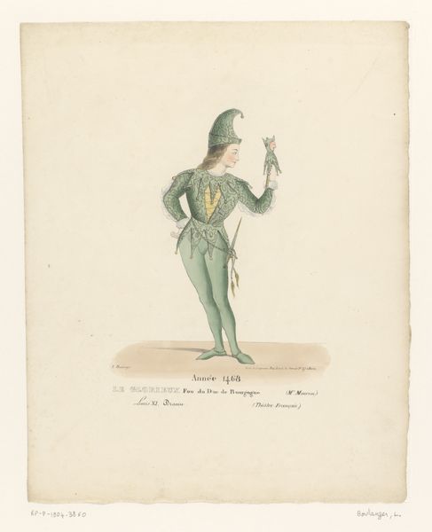Curator: Here we have a portrait, believed to be from around 1880 to 1884, titled "Portret van graaf Ferdinand Trauttmansdorff-Weinsberg." The anonymous artist captured the Count using watercolors, which is somewhat unusual for such a formal subject. Editor: My first impression? He looks like a really serious Peter Pan! It's those leafy greens and the rather...pointed shoes. But there’s something quite regal about the way he holds himself. A fascinating mix of worlds colliding, maybe even warring. Curator: Precisely! Observe the artist's attention to detail; each fabric is rendered meticulously, from the velvet jacket to the delicate lace at his neck. There's a clear dedication to realism within the academic style. The portrait operates on a system of controlled contrasts: light versus shadow, smooth versus textured. It speaks of status, decorum, a deliberate presentation of self. Editor: That rigid posture definitely echoes your “decorum” comment, almost as if he's presenting himself in a kind of theatrical performance for the ages. But his gaze… is it just me, or is there a flicker of mischief in those eyes? A rebellion bubbling under that stiff exterior. I feel I want to know what it feels like to be him, locked in such old clothing and role. I am touched. Curator: An astute observation. Perhaps the watercolor medium lends itself to this nuanced reading, with its fluidity and transparency offering a softer edge than, say, oil paint. Consider how the academic-style dictates representation in this portrait, compared to a more fluid watercolor treatment. We must attend to its historical-painting quality to analyze its purpose, especially through costume choices. Editor: Maybe. Or perhaps, he's just longing for a pair of modern jeans! This image leaves a curious aftertaste, a lingering feeling of formality undercut by… human vulnerability. A testament of how even in rigidity we can sense and maybe even see the pulse of change struggling within. What a conundrum this noble gent provides for us. Curator: Indeed. The image encourages us to explore how technique serves both to reinforce and subtly undermine social convention, leaving space for interpretation and imagination to wonder who Graaf Ferdinand was as a man, separate from his title and era. Thank you for these astute thoughts, I hadn’t felt it until now.