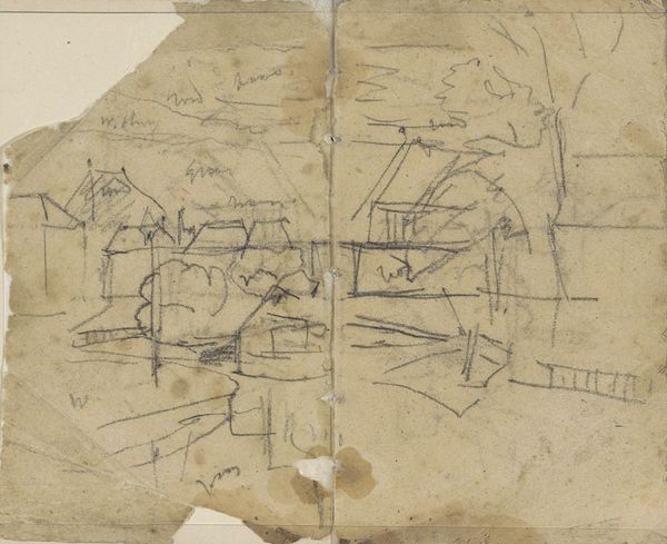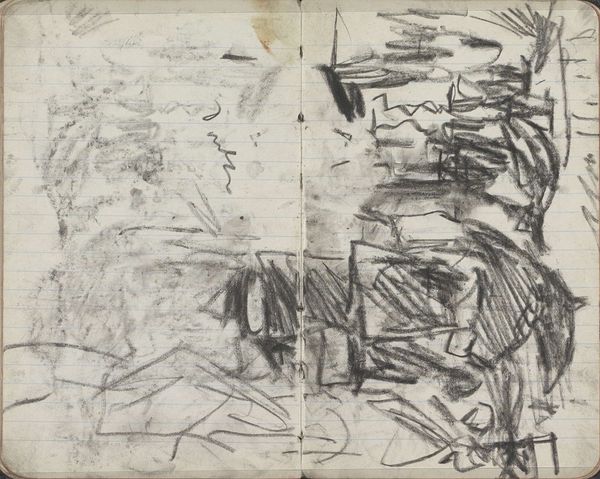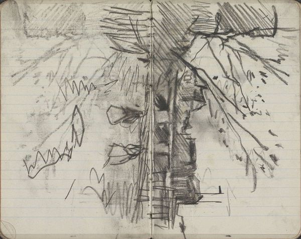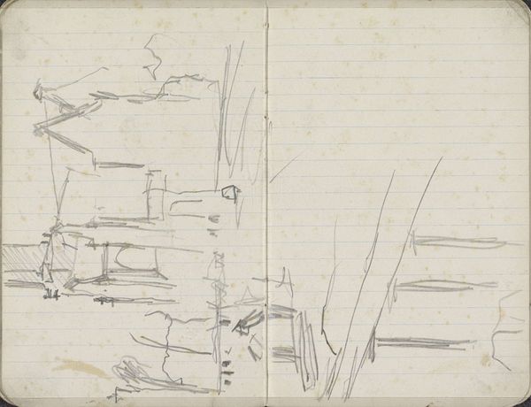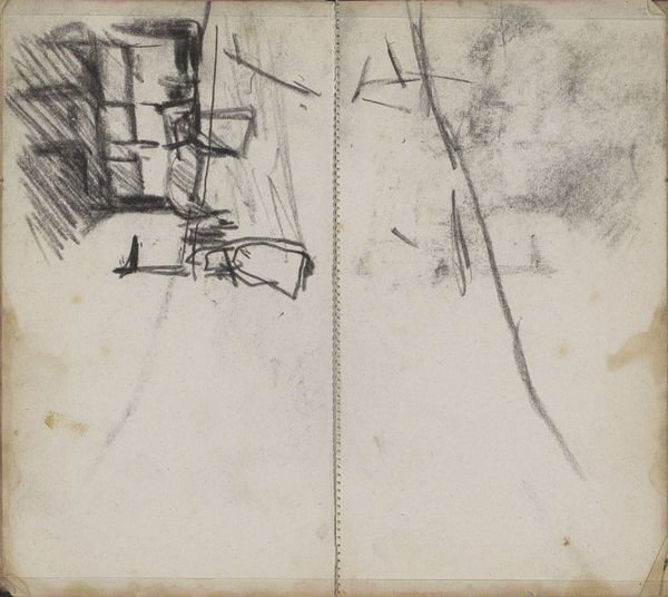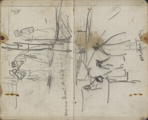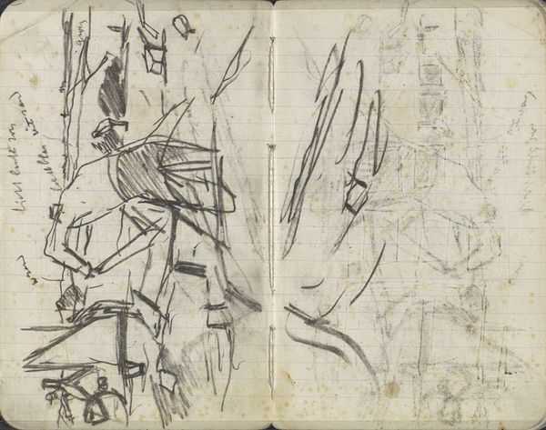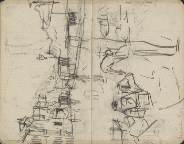 This is a page from a sketchbook by George Hendrik Breitner, likely dating to the late 19th or early 20th century, rendered in graphite on paper. The grid of the page is visible beneath the heavy marks, and it reminds us that drawing is itself a kind of labor, a structured activity. Breitner worked rapidly, as you can see from the energetic lines and smudged areas. The texture of the paper is also important, lending a toothy quality to the drawing. We can consider the sketchbook itself a crucial tool of modern artistic production. It allowed artists to capture fleeting moments and work out ideas in a portable format. In this way, the book becomes a repository of potential, ready to be activated in the studio later on. It's a direct record of Breitner's perception, a glimpse into his working process. Recognizing the value of these everyday materials allows us to connect with the artist's experience and understand his working methods, challenging the traditional hierarchy between finished works and preparatory studies.