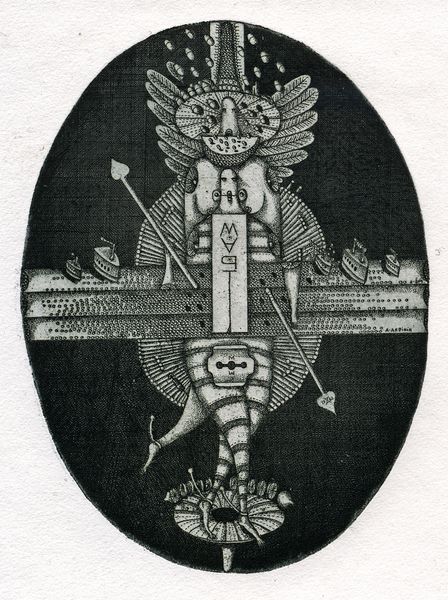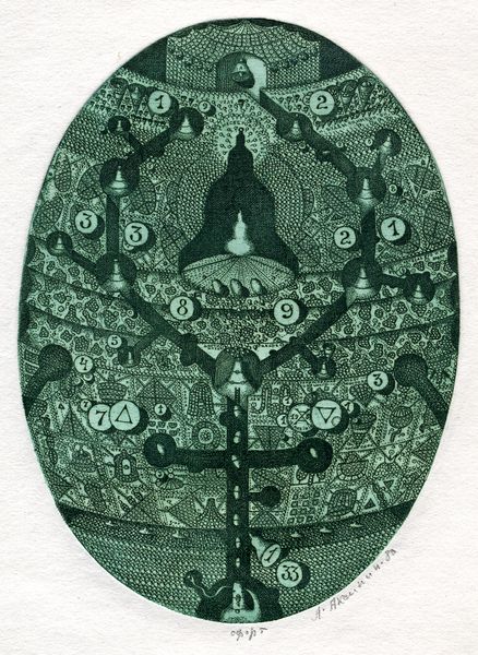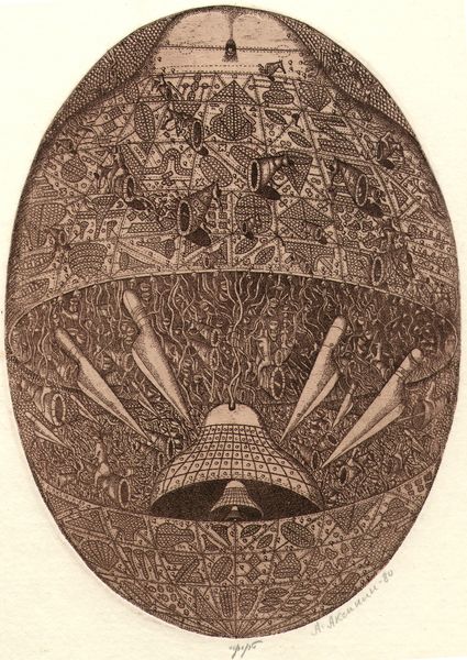 Oleksandr Aksinin made this small, detailed print, titled V, sometime before 1985. It’s all about the process, isn’t it? The way he builds up the image from tiny, obsessive marks, creating textures and patterns. The color is almost monochrome, a muted green that feels both futuristic and archaic. It reminds me of old blueprints or maybe some kind of strange, biological diagram. Look at the way he uses hatching to create depth, how the density of the lines makes some areas recede while others pop forward. The whole thing feels like a puzzle. My eye keeps getting drawn to the central structure, like some kind of bizarre machine or temple. It’s hard to tell exactly what it is, but the level of detail is mesmerizing. Aksinin's work reminds me a little bit of Paul Klee, that same playful exploration of form and line. Art isn’t about answers, it’s about the questions that keep us looking.