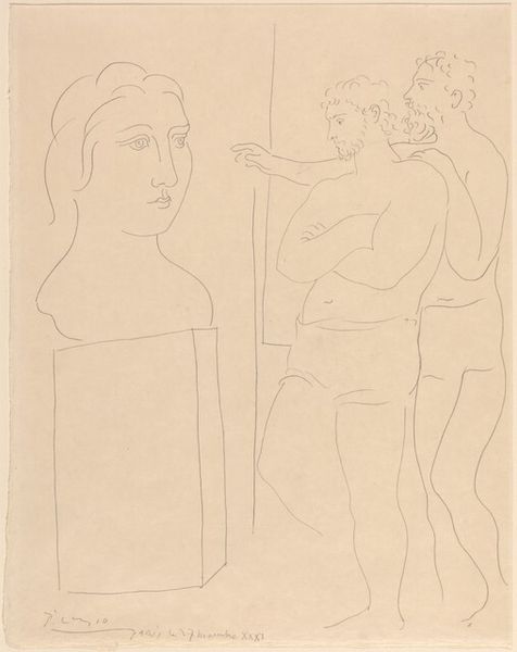 This etching by Pablo Picasso shows an artist’s studio with a model, painting, and sculpture. It was made using a printmaking technique. A metal plate, likely copper, was coated with a waxy, acid-resistant substance. Picasso then scratched his design through this coating, exposing the metal. When the plate was immersed in acid, the exposed lines were ‘bitten,’ creating grooves. Ink was then applied to these grooves, the surface wiped clean, and paper pressed against the plate to transfer the image. Notice how this process influences the image’s appearance, particularly the delicate, linear quality, and how the etched lines vary in thickness and depth, adding tone and shadow. There’s also the question of labor. Printmaking is indirect, mediated by tools and chemistry. It invites comparison between the artist's hand and the kind of labor that goes into industrial production, a timely question at the period. Ultimately, this print requires us to consider the intricate relationship between the artist's hand, the mechanical process, and the final image, challenging our notions of originality and artistic creation.