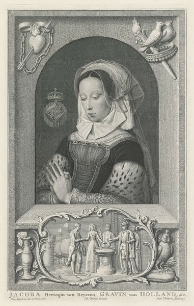 Curator: It's remarkable how much historical weight can be packed into a seemingly simple engraving. Here we have "Portret van Jacoba van Beieren," dating somewhere between 1840 and 1884, credited to Johann Wilhelm Kaiser. It resides here at the Rijksmuseum, a poignant echo from the past. Editor: There's something incredibly delicate and yet also strangely stern about her expression. The tight lines of the print emphasize the detail of her dress and veil, but the averted gaze… she's lost in thought, isn't she? A kind of captured sadness. Curator: Indeed. The image itself is fascinating, because it leans heavily into an idealized vision of Jacoba, almost romanticizing her. Her hands clasped in prayer position might signal devotion, but equally a sort of powerlessness or entreaty. Consider how different eras interpreted historical figures through the lens of their own values. Editor: Right. The crown hovering above her nameplate—"Jakoba van Beieren"—it feels less like a celebration and more like a gilded cage. She looks constrained by the very symbol that defined her. It's as if the artist is acknowledging her royal status while hinting at the sacrifices she made to keep that status. Curator: It is compelling to see this intersection of power and perceived vulnerability. Kaiser, creating this print centuries after Jacoba's life, has distilled her into a set of signifiers that represent not just her, but an entire narrative of leadership, betrayal, and ultimately, perhaps, resignation. Even her clothing which might signal wealth and high-status in reality feels rigid, and tomb-like. Editor: Precisely! And I think this piece manages to stir emotions still, even from this distance. Perhaps that's what I'm drawn to. I imagine standing before her, in awe of her legacy, her apparent resolve… But seeing a shadow of internal turmoil, too. Makes one think, what truly matters most, when push comes to shove? Curator: A crucial thing to contemplate when we consider historical figures and how we perceive them. Ultimately, “Portret van Jacoba van Beieren” gives us much to consider, inviting dialogue around power, identity and perception. Editor: Beautifully said! I think this old engraving actually just helped me confront some more complex parts of myself too. Until next time.