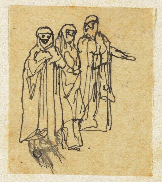 Curator: Here we have Rembrandt van Rijn's "Study Sheet with Three Women and a Boy," created circa 1638-1639. It's an ink drawing, a seemingly simple piece yet pregnant with meaning. Editor: It's so immediate, so raw! The ink strokes capture something profound—a quietness, almost a weariness, especially in the posture of the draped figures. It looks like a document of the invisible, the everyday gestures usually overlooked. Curator: Indeed. Considering Rembrandt's broader artistic and social context, it becomes even more interesting. Look at the figures. Their clothes, while sketch-like, tell of a particular social status, perhaps religious order, maybe even models used to convey feelings that the establishment didn't like. Editor: Their clothing strikes me, too. It’s so stylized. I wonder about the historical context. The head coverings evoke ideas of piety, the roles of women…it definitely speaks to prescribed gender roles of the time. The way they use to dress in middle east, even religious differences within them can be seen through garments, can you appreciate the symbolic connections? Curator: Absolutely. Gender and faith are at the very center. Their very stances embody a spectrum of emotions linked to those identities: contemplation, resignation, maybe even defiance. These themes have never left us, aren’t just trapped on time! It shows its lasting legacy through history! Editor: And look at the medium. The pen-and-ink lends itself so well to emotional intensity, allowing a glimpse into intimate space. Do you think there may be influence from the Catholic movement, perhaps it had an affect into his paintings as well? I keep going back to how the lines have evolved through our common human experience… Curator: You are not wrong, even today, the conversation and challenges of society keep happening and coming again from generation to generation. This seemingly straightforward drawing opens doors to complex intersections of identity, social class, and perhaps unconscious power structures of that era. Editor: Absolutely. Thank you! Thinking about art like this…unearths hidden pathways between symbols and feelings. It reminds me that even historical figures shared familiar emotional terrain.