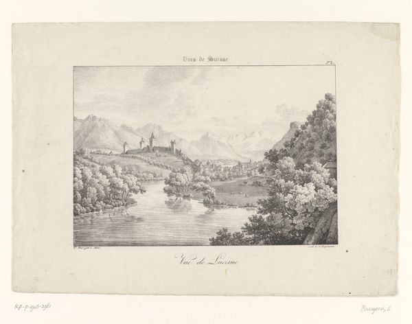 Curator: There's a sense of profound calm that settles over me looking at this print. The texture feels dreamlike. Editor: That's interesting. This etching by Henry Winsor Bond, circa 1836, titled "View Near Plastria on the River Saison, France," certainly evokes the picturesque, doesn't it? It speaks to the Romantic era’s idealization of nature. Curator: Definitely. Water is a central feature—as it often is in our symbolic language— representing the ebb and flow of time. And then a cow and what appear to be two women near the shore…a scene of simple, rural life. There is the wooden bridge uniting the landscapes on both sides, which speaks to connectivity, journeys, and passages between states of being. Editor: Note that the presence of women suggests the gendering of this landscape: domesticity and care situated within this constructed ideal. It presents a counter-narrative to industrialized Europe but likely represents a patriarchal interpretation of this rural scene. Curator: Absolutely, there’s a strong tension at play. Notice how the mountains in the background, rendered with hazy detail, serve as enduring symbols of the eternal, which offers a glimpse into our need for permanence. Editor: Yes, the composition directs our eye from the immediate, domestic activities towards that distant, timeless landscape, which effectively places the working class and the daily toil in a longer temporality. This artistic choice may further romanticize it, making the subjects almost picturesque—flattening any notion of political reality. Curator: It highlights the enduring need to find resonance, meaning, or transcendence through the simple act of mark-making on a page, reflecting the power of artistic traditions in our ever-evolving visual culture. Editor: Indeed, it forces us to consider the power dynamics implicit in romanticizing pastoral life. This view near Plastria becomes more complex when we situate it within historical power structures. Curator: Seeing the artwork this way illuminates aspects I wouldn't have noticed. I am also drawn to think of all of the journeys the image itself had had. Editor: For me, the social dynamics here continue to linger. Perhaps, we both bring different but valid ideas of meaning and insight when considering artworks of the past.